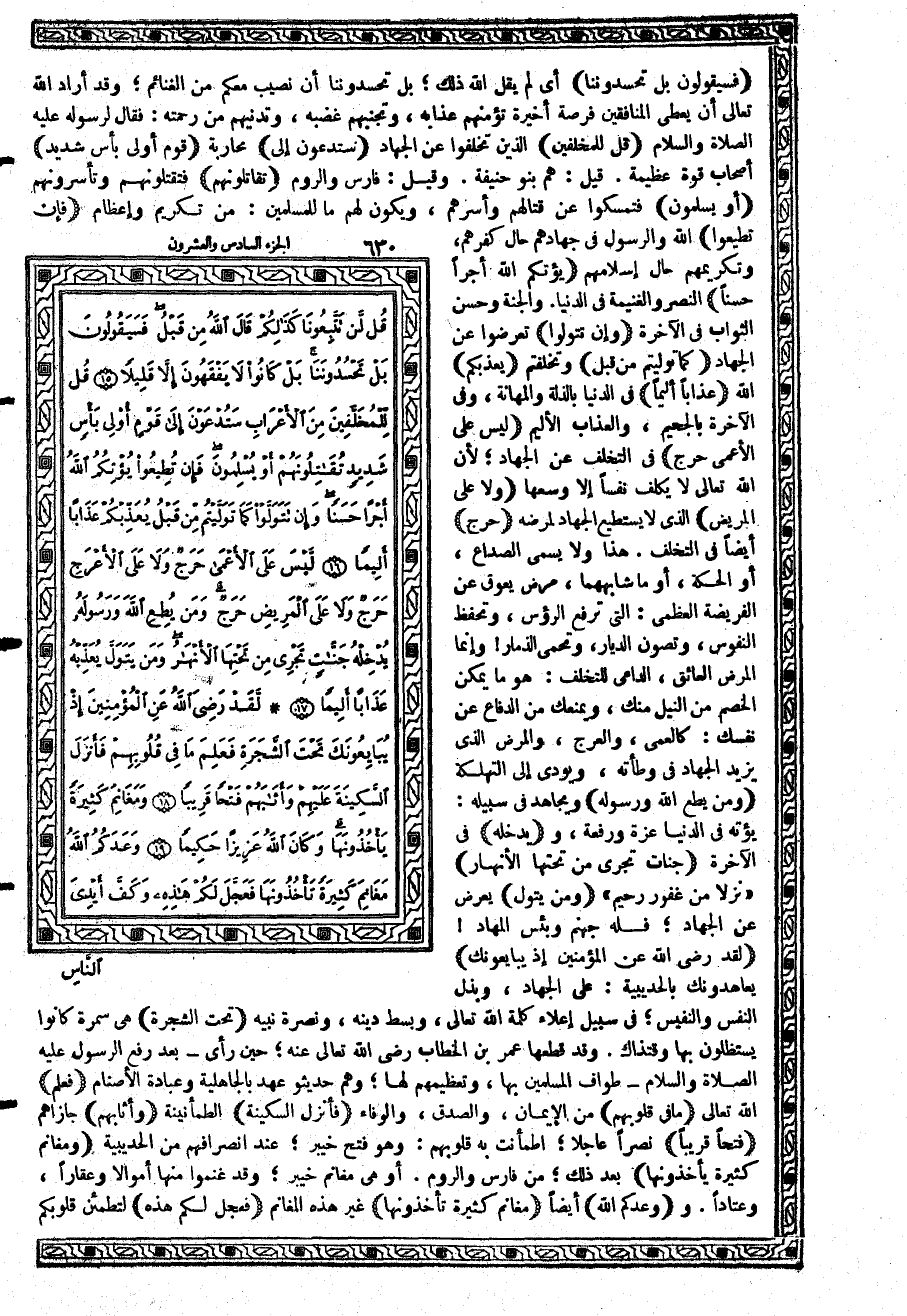 {لَّقَدْ رَضِيَ اللَّهُ عَنِ الْمُؤْمِنِينَ إِذْ يُبَايِعُونَكَ} يعاهدونك بالحديبية: على الجهاد، وبذل النفس والنفيس؛ في سبيل إعلاء كلمة الله تعالى، وبسط دينه، ونصرة نبيه {تَحْتَ الشَّجَرَةِ} هي سمرة كانوا يستظلون بها وقتذاك. وقد قطعها عمربن الخطاب رضي الله تعالى عنه؛ حين رأى - بعد رفع الرسول عليه الصلاة والسلام - طواف المسلمين بها، وتعظيمهم لها؛ وهم حديثو عهد بالجاهلية وعبادة الأصنام {فَعَلِمَ} الله تعالى {مَا فِي قُلُوبِهِمْ} من الإيمان، والصدق، والوفاء {فَأنزَلَ السَّكِينَةَ} الطمأنينة {وَأَثَابَهُمْ} جازاهم {فَتْحاً قَرِيباً} نصراً عاجلاً؛ اطمأنت به قلوبهم: وهو فتح خيبر؛ عند انصرافهم من الحديبية