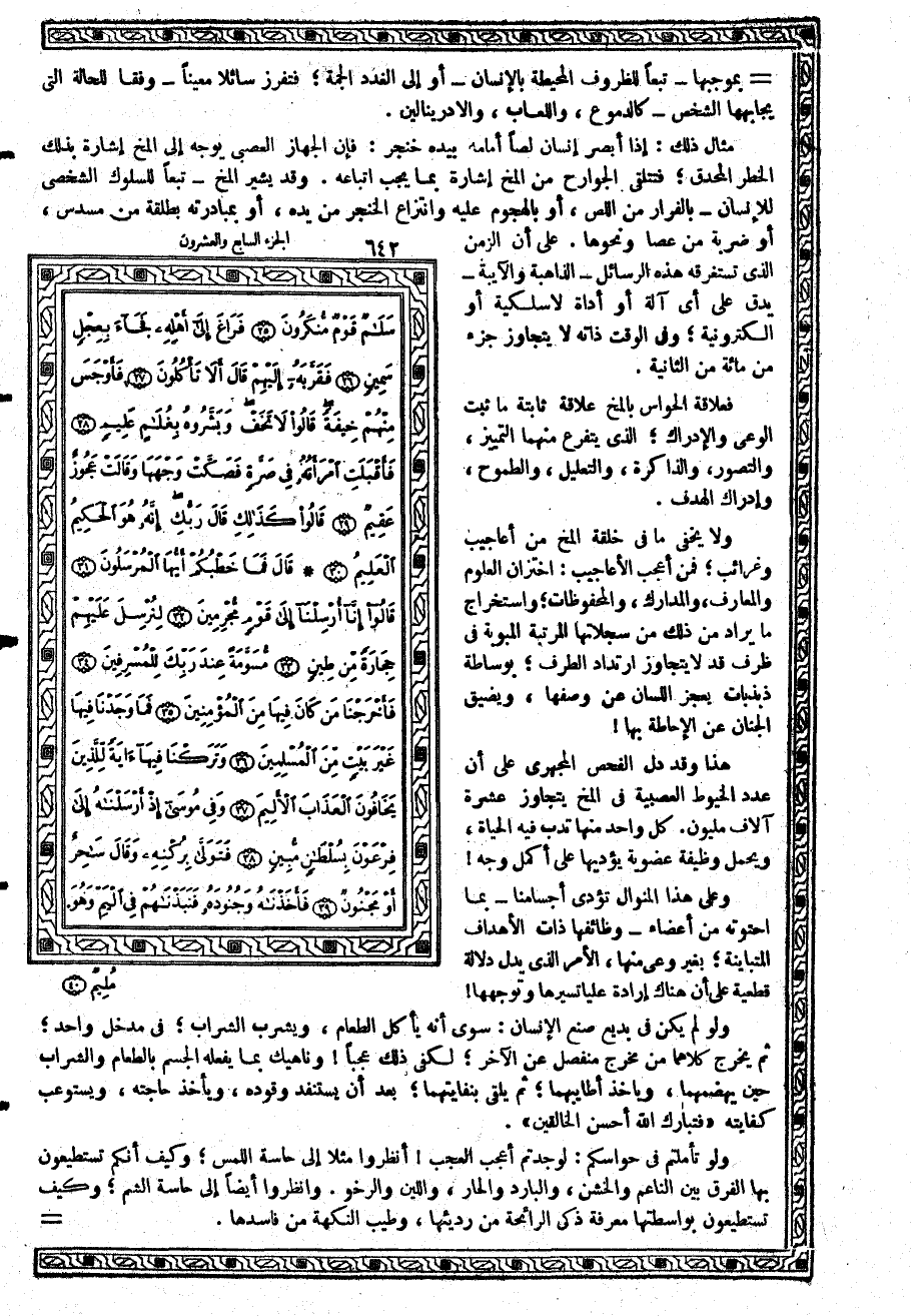 ولا يخفى ما في خلقة المخ من أعاجيب وغرائب؛ فمن أعجب الأعاجيب: اختزان العلوم والمعارف، والمدارك، والمحفوظات؛ واستخراج ما يراد من ذلك من سجلاتها المرتبة المبوبة في ظرف قد لا يتجاوز ارتداد الطرف؛ بوساطة ذبذبات يعجز اللسان عن وصفها، ويضيق الجنان عن الإحاطة بها