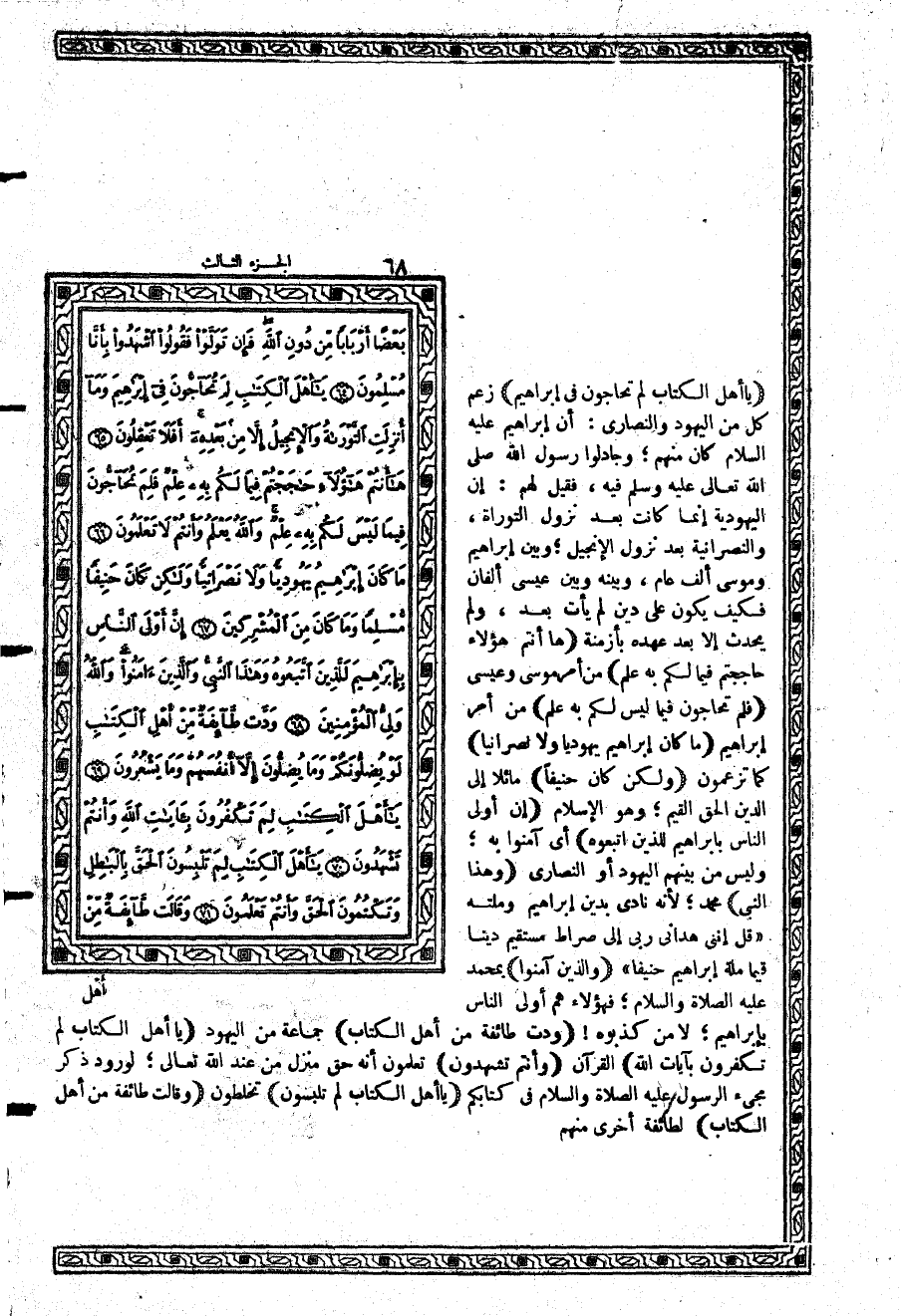 {يأَهْلَ الْكِتَابِ لِمَ تُحَآجُّونَ فِي إِبْرَاهِيمَ} زعم كل من اليهود والنصارى: أن إبراهيم عليه السلام كان منهم؛ وجادلوا رسولالله فيه، فقيل لهم: إن اليهودية إنما كانت بعد نزول التوراة، والنصرانية بعد نزول الإنجيل؛ وبين إبراهيم وموسى ألف عام، وبينه وبين عيسى ألفان فكيف يكون على دين لم يأت بعد، ولم يحدث إلا بعد عهده بأزمنة؟