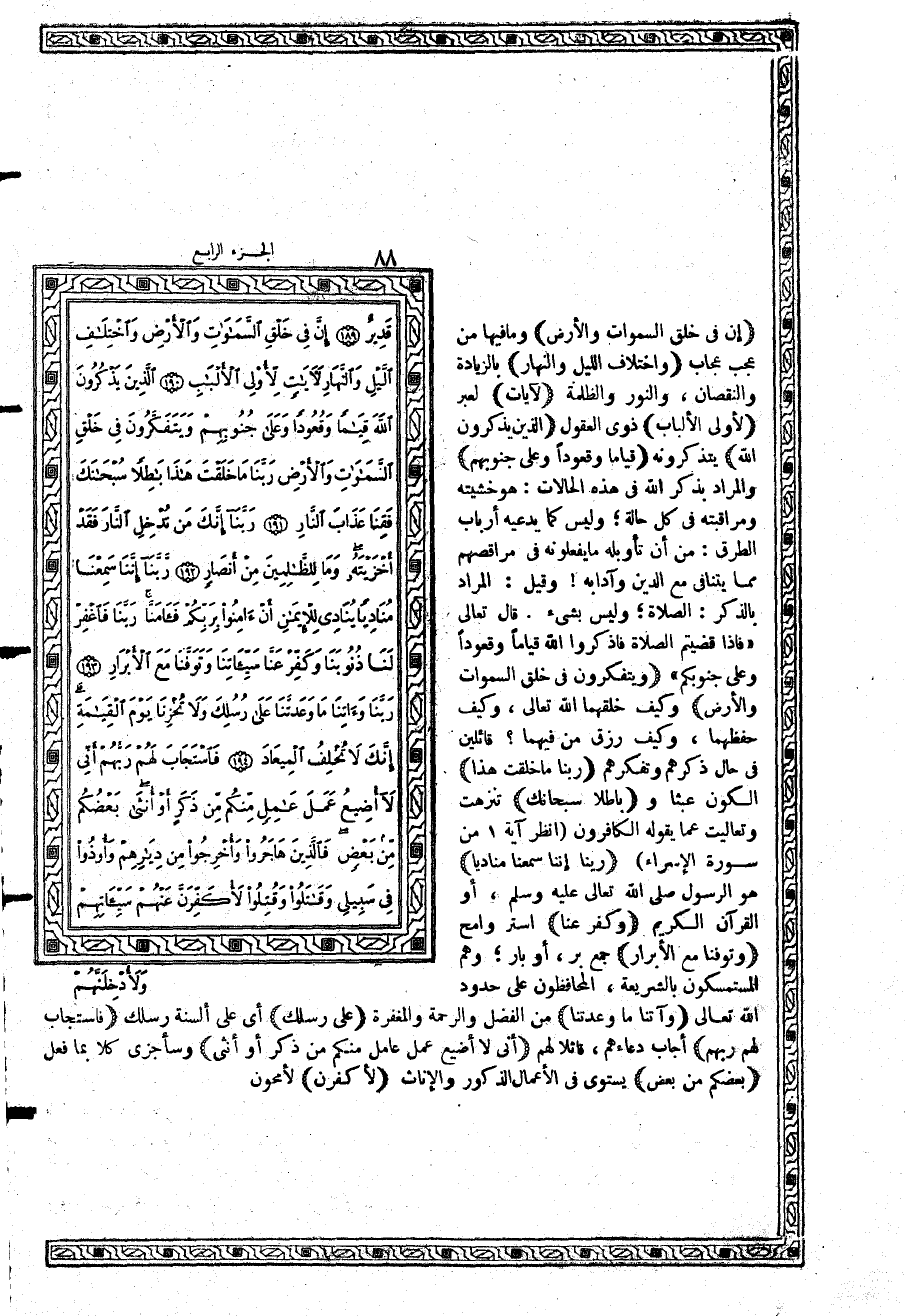 {الَّذِينَ يَذْكُرُونَ اللَّهَ} يتذكرونه {قِيَاماً وَقُعُوداً وَعَلَى جُنُوبِهِمْ} والمراد بذكر الله في هذه الحالات: هو خشيته ومراقبته في كل حالة؛ وليس كما يدعيه أرباب الطرق: من أن تأويله ما يفعلونه في مراقصهم مما يتنافى مع الدين وآدابه وقيل: المراد بالذكر: الصلاة؛ وليس بشيء. قال تعالى: {فَإِذَا قَضَيْتُمُ الصَّلاَةَ فَاذْكُرُواْ اللَّهَ قِيَاماً وَقُعُوداً وَعَلَى جُنُوبِكُمْ} {وَيَتَفَكَّرُونَ فِي خَلْقِ السَّمَاوَاتِ وَالأَرْضِ} وكيف خلقهما الله تعالى، وكيف حفظهما، وكيف رزق من فيهما؟ قائلين في حال ذكرهم وتفكرهم {رَبَّنَآ مَا خَلَقْتَ هَذا} الكون عبثاً و {بَاطِلاً سُبْحَانَكَ} تنزهت وتعاليت عما يقوله الكافرون (أنظر آية صلى الله عليه وسلّم من سورة الإسراء)
