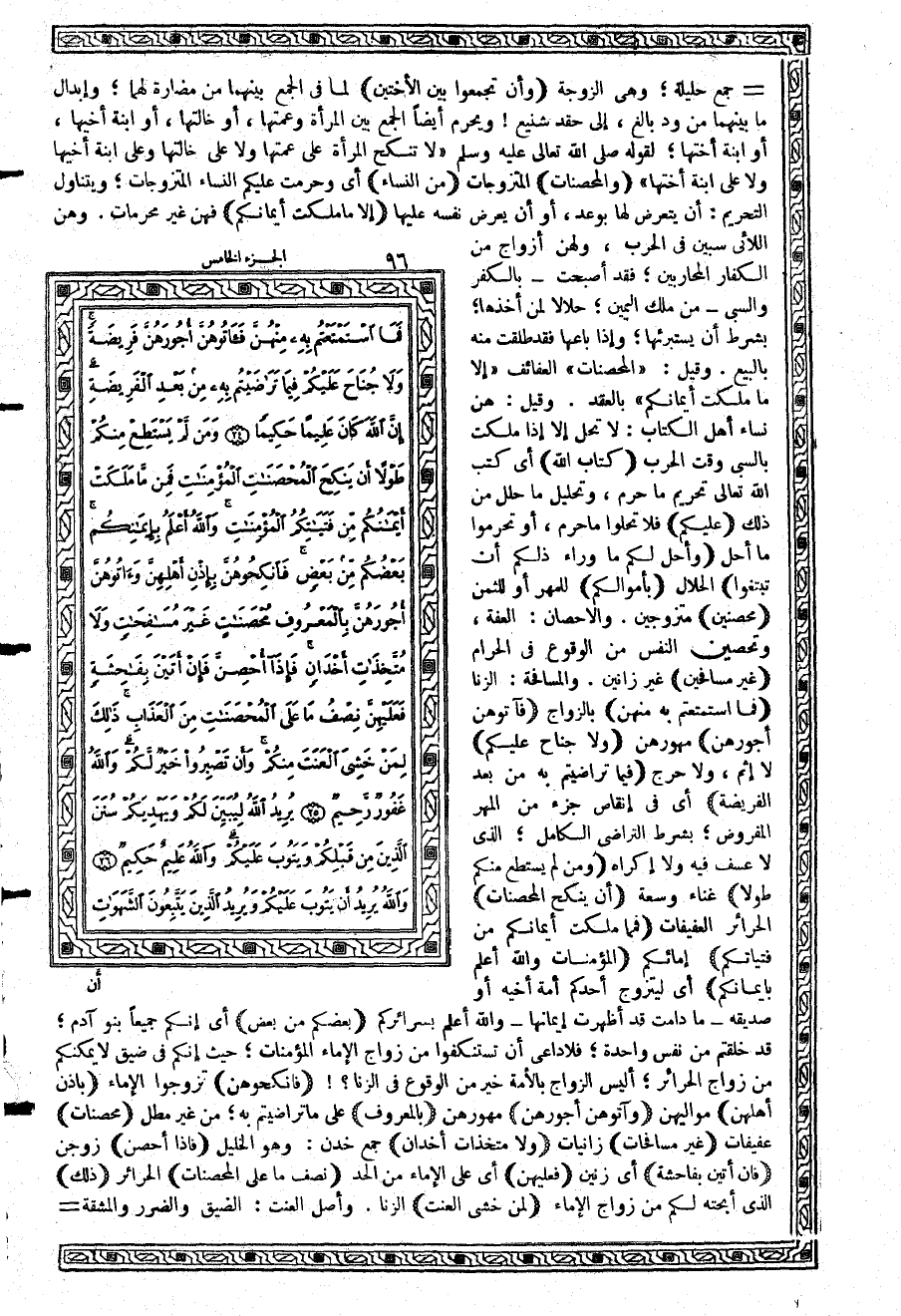 {وَالْمُحْصَنَاتُ} المتزوجات {مِّنَ النِّسَآءِ} أي وحرمت عليكم النساء المتزوجات؛ ويتناول التحريم: أن يتعرض لها بوعد، أو أن يعرض نفسه عليها {إِلاَّ مَا مَلَكْتَ أَيْمَانُكُمْ} فهن غير محرمات. وهن اللائي سبين في الحرب، ولهن أزواج من الكفار المحاربين؛ فقد أصبحت - بالكفر والسبي - من ملك اليمين؛ حلالاً لمن أخذها؛ بشرط أن يستبرئها؛ وإذا باعها فقد طلقت منه بالبيع. وقيل: «المحصنات» العفائف {إِلاَّ مَا مَلَكْتَ أَيْمَانُكُمْ} بالعقد. وقيل: هن نساء أهل الكتاب: لا تحل إلا إذا ملكت بالسبي وقت الحرب {كِتَابَ اللَّهِ} أي كتب الله تعالى تحريم ما حرم، وتحليل ما حلل من ذلك {عَلَيْكُمْ} فلا تحلوا ما حرم، أو تحرموا ما أحل {وَأُحِلَّ لَكُمْ مَّا وَرَاءَ ذَلِكُمْ أَن تَبْتَغُواْ} الحلال {بِأَمْوَالِكُمْ} للمهر أو للثمن {مُّحْصِنِينَ} متزوجين. والإحصان: العفة، وتحصين النفس من الوقوع في الحرام {غَيْرَ مُسَافِحِينَ} غير زانين. والمسافحة: الزنا {فَمَا اسْتَمْتَعْتُمْ بِهِ مِنْهُنَّ} بالزواج {فَآتُوهُنَّ أُجُورَهُنَّ} مهورهن {وَلاَ جُنَاحَ عَلَيْكُمْ} لا إثم، ولا حرج {فِيمَا تَرَاضَيْتُمْ بِهِ مِن بَعْدِ الْفَرِيضَةِ} أي في إنقاص جزء من المهر المفروض؛ بشرط التراضي الكامل؛ الذي لا عسف فيه ولا إكراه غناء وسعة