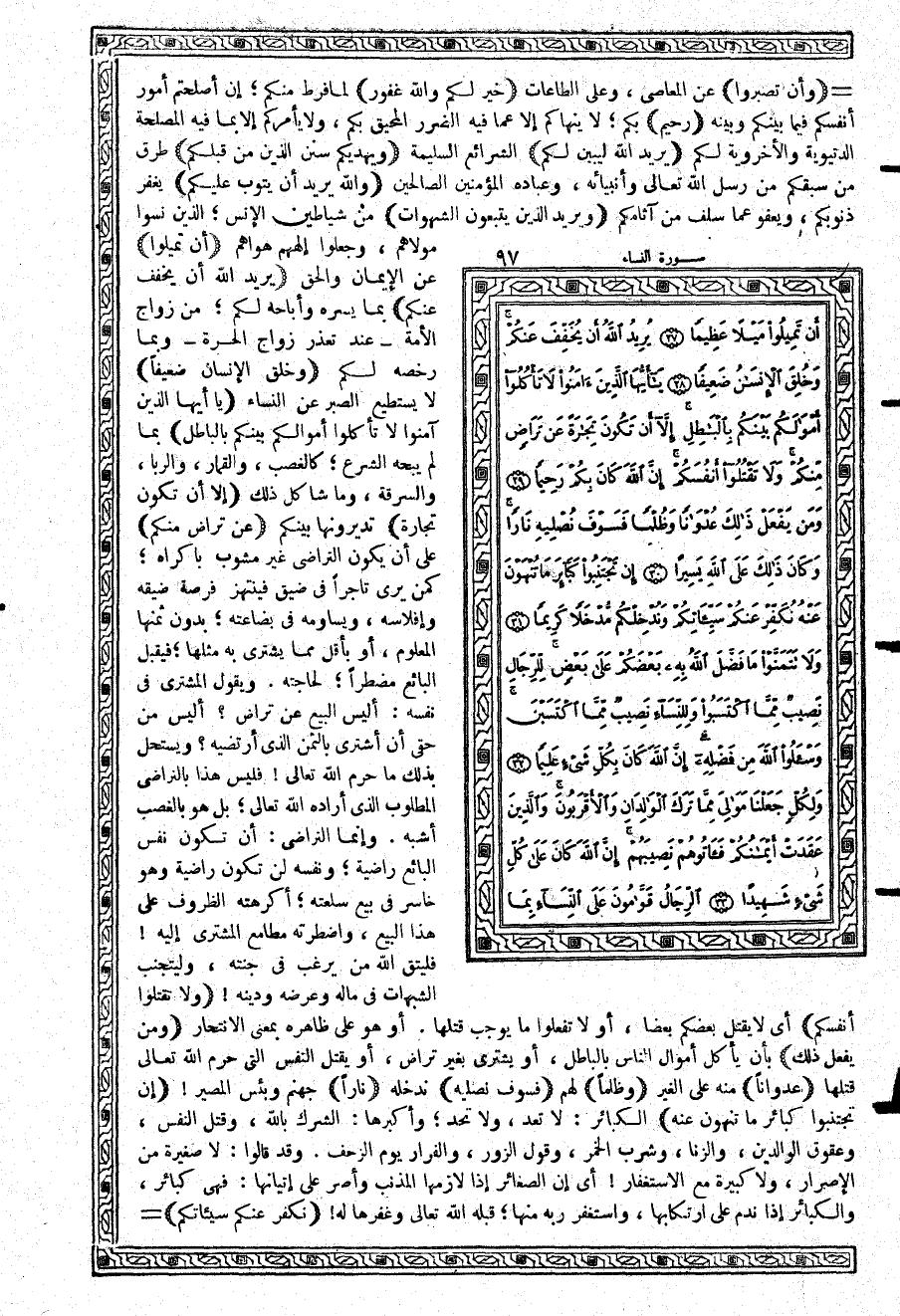 {إِلاَّ أَن تَكُونَ تِجَارَةً} تديرونها بينكم {عَن تَرَاضٍ مِّنْكُمْ} على أن يكون التراضي غير مشوب بإكراه؛ كمن يرى تاجراً في ضيق فينتهز فرصة ضيقه وإفلاسه، ويساومه في بضاعته، بدون ثمنها المعلوم، أو بأقل مما يشتري به مثلها؛ فيقبل البائع مضطراً؛ لحاجته. ويقول المشتري في نفسه: أليس البيع عن تراض؟ أليس من حقي أن أشتري بالثمن الذي أرتضيه؟ ويستحل بذلك ما حرم الله تعالى فليس هذا بالتراضي المطلوب الذي أراده الله تعالى؛ بل هو بالغصب أشبه. وإنما التراضي: أن تكون نفس البائع راضية؛ ونفسه لن تكون راضية وهو خاسر في بيع سلعته؛ أكرهته الظروف على هذا البيع، واضطرته مطامع المشتري إليه فليتق الله من يرغب في جنته، وليتجنب الشبهات في ماله وعرضه ودينه {وَلاَ تَقْتُلُواْ أَنْفُسَكُمْ} أي لا يقتل بعضكم بعضاً، أو لا تفعلوا ما يوجب قتلها. أو هو على ظاهره بمعنى الانتحار