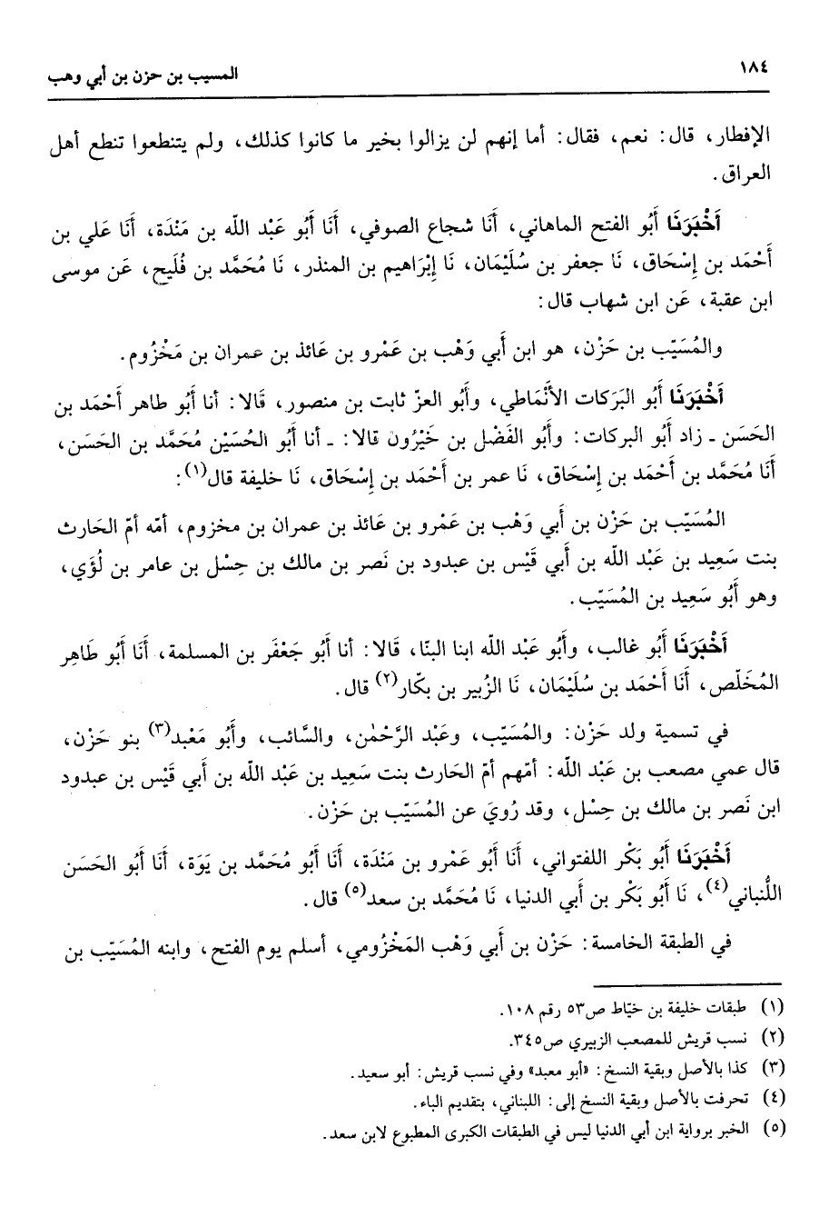 الإفطار قال نعم فقال أما إنهم لن يزالوا بخير ما كانوا كذلك ولم يتنطعوا تنطع أهل العراق أخبرنا أبو الفتح الماهاني أنا شجاع الصوفي أنا أبو عبد الله بن مندة أنا علي بن أحمد بن إسحاق نا جعفر بن سليمان نا إبراهيم بن المنذر نا محمد بن فليح عن موسى ابن عقبة عن ابن شهاب قال والمسيب بن حزن هو ابن أبي وهب بن عمرو بن عائذ بن عمران بن مخزوم أخبرنا أبو البركات الأنماطي وأبو العز ثابت بن منصور قالا أنا أبو طاهر أحمد بن الحسن زاد أبو البركات وأبو الفضل بن خيرون قالا أنا أبو الحسين محمد بن الحسن أنا محمد بن أحمد بن إسحاق نا عمر بن أحمد بن إسحاق نا خليفة قال (1) المسيب بن حزن بن أبي وهب بن عمرو بن عائذ بن عمران بن مخزوم أمه ام الحارث بنت سعيد بن عبد الله بن أبي قيس بن عبدود بن نصر بن مالك بن حسل بن عامر بن لؤي وهو أبو سعيد بن المسيب أخبرنا أبو غالب وأبو عبد الله ابنا البنا قالا أنا أبو جعفر بن المسلمة أنا أبو طاهر المخلص أنا أحمد بن سليمان نا الزبير بن بكار (2) قال في تسمية ولد حزن والمسيب وعبد الرحمن والسائب وأبو معبد (3) بنو حزن قال عمي مصعب بن عبد الله أمهم أم الحارث بنت سعيد بن عبد الله بن أبي قيس بن عبدود ابن نصر بن مالك بن حسل وقد روي عن المسيب بن حزن أخبرنا أبو بكر اللفتواني أنا أبو عمرو بن مندة أنا أبو محمد بن يوة أنا أبو الحسن اللنباني (4) نا أبو بكر بن أبي الدنيا نا محمد بن سعد (5) قال في الطبقة الخامسة حزن بن أبي وهب المخزومي أسلم يوم الفتح وابنه المسيب بن
