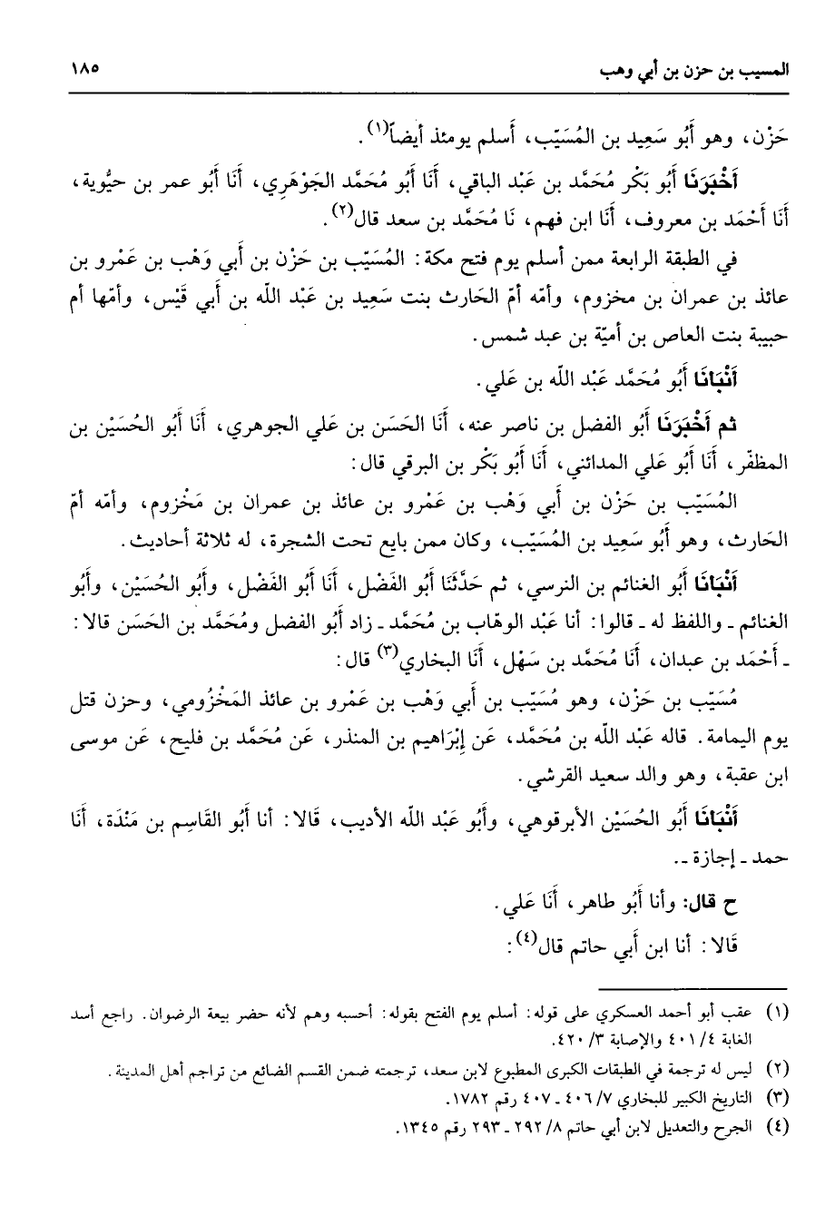 حزن وهو أبو سعيد بن المسيب أسلم يومئذ ايضا (1) أخبرنا أبو بكر محمد بن عبد الباقي أنا أبو محمد الجوهري أنا أبو عمر بن حيوية أنا أحمد بن معروف أنا ابن فهم نا محمد بن سعد قال (2) في الطبقة الرابعة ممن أسلم يوم فتح مكة المسيب بن حزن بن أبي وهب بن عمرو بن عائذ بن عمران بن مخزوم وأمه أم الحارث بنت سعيد بن عبد الله بن أبي قيس وأمها أم حبيبة بنت العاص بن أمية بن عبد شمس أنبأنا أبو محمد عبد الله بن علي ثم أخبرنا أبو الفضل بن ناصر عنه أنا الحسن بن علي الجوهري أنا أبو الحسين بن المظفر أنا أبو علي المدائني أنا أبو بكر بن البرقي قال المسيب بن حزن بن أبي وهب بن عمرو بن عائذ بن عمران بن مخزوم وأمه أم الحارث وهو أبو سعيد بن المسيب وكان ممن بايع تحت الشجرة له ثلاثة أحاديث أنبأنا أبو الغنائم بن النرسي ثم حدثنا أبو الفضل أنا أبو الفضل وأبو الحسين وأبو الغنائم واللفظ له قالوا أنا عبد الوهاب بن محمد زاد أبو الفضل ومحمد بن الحسن قالا أحمد بن عبدان أنا محمد بن سهل أنا البخاري (3) قال مسيب بن حزن وهو مسيب بن أبي وهب بن عمرو بن عائذ المخزومي وحزن قتل يوم اليمامة قاله عبد الله بن محمد عن إبراهيم بن المنذر عن محمد بن فليح عن موسى ابن عقبة وهو والد سعيد القرشي أنبأنا أبو الحسين الإبرقوهي وأبو عبد الله الأديب قالا أنا أبو القاسم بن مندة أنا حمد إجازة ح قال وأنا أبو طاهر أنا علي قالا أنا ابن أبي حاتم قال (4)