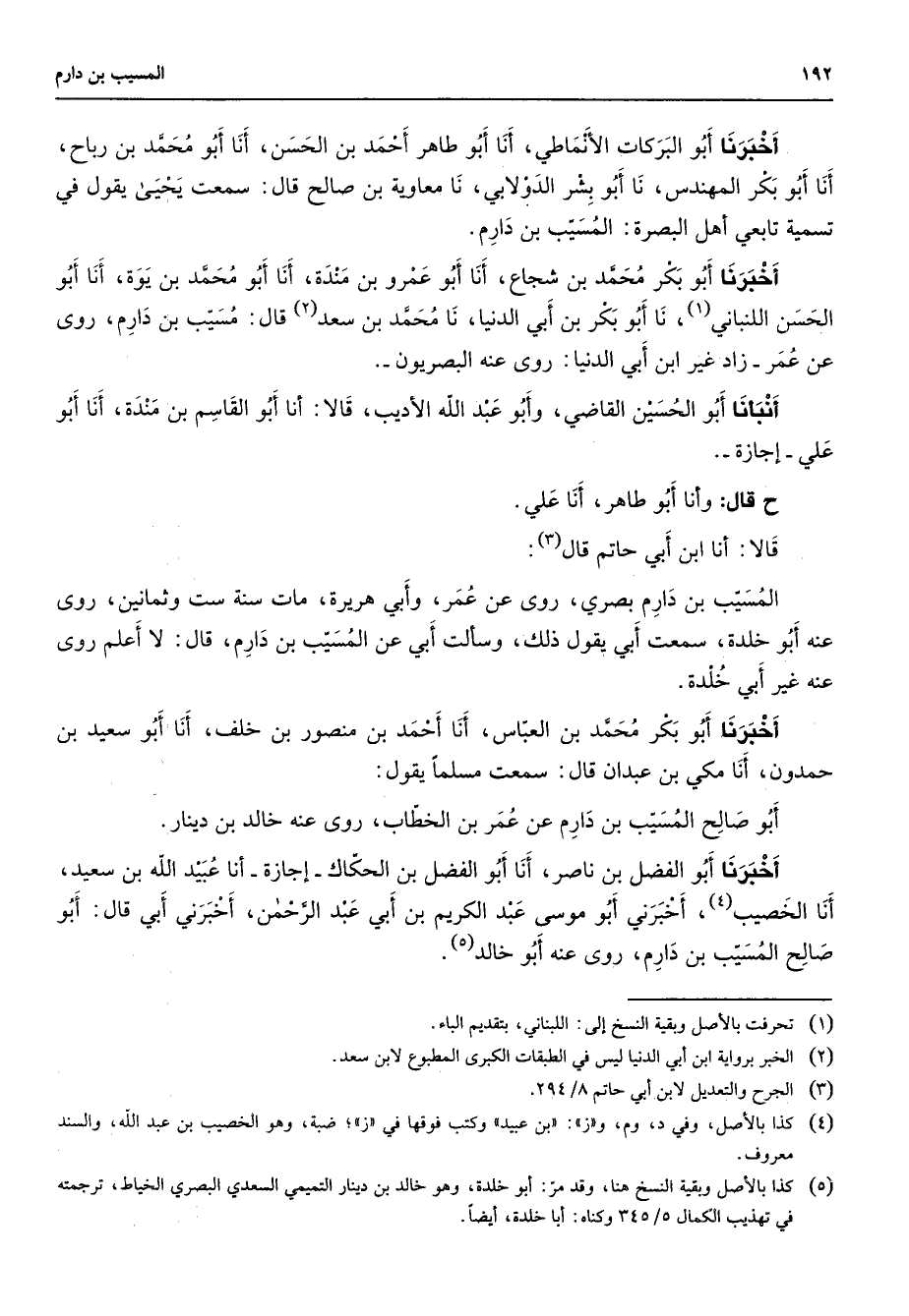 أخبرنا أبو البركات الأنماطي أنا أبو طاهر أحمد بن الحسن أنا أبو محمد بن رباح أنا أبو بكر المهندس نا أبو بشر الدولابي نا معاوية بن صالح قال سمعت يحيى يقول في تسمية تابعي أهل البصرة المسيب بن دارم أخبرنا أبو بكر محمد بن شجاع أنا أبو عمرو بن مندة أنا أبو محمد بن يوة أنا أبو الحسن اللنباني (1) نا أبو بكر بن أبي الدنيا نا محمد بن سعد (2) قال مسيب بن دارم روى عن عمر زاد غير ابن أبي الدنيا روى عنه البصريون أنبأنا أبو الحسين القاضي وأبو عبد الله الأديب قالا أنا أبو القاسم بن مندة أنا أبو علي إجازة ح قال وأنا أبو طاهر أنا علي قالا أنا ابن أبي حاتم قال (3) المسيب بن دارم بصري روى عن عمر وأبي هريرة مات سنة ست وثمانين روى عنه أبو خلدة سمعت أبي يقول ذلك وسالت أبي عن المسيب بن دارم قال لا أعلم روى عنه غير أبي خلدة أخبرنا أبو بكر محمد بن العباس أنا أحمد بن منصور بن خلف أنا أبو سعيد بن حمدون أنا مكي بن عبدان قال سمعت مسلما يقول أبو صالح المسيب بن دارم عن عمر بن الخطاب روى عنه خالد بن دينار أخبرنا أبو الفضل بن ناصر أنا أبو الفضل بن الحكاك إجازة أنا عبيد الله بن سعيد أنا الخصيب (4) أخبرني أبو موسى عبد الكريم بن أبي عبد الرحمن أخبرني أبي قال أبو صالح المسيب بن دارم روى عنه أبو خالد (5)