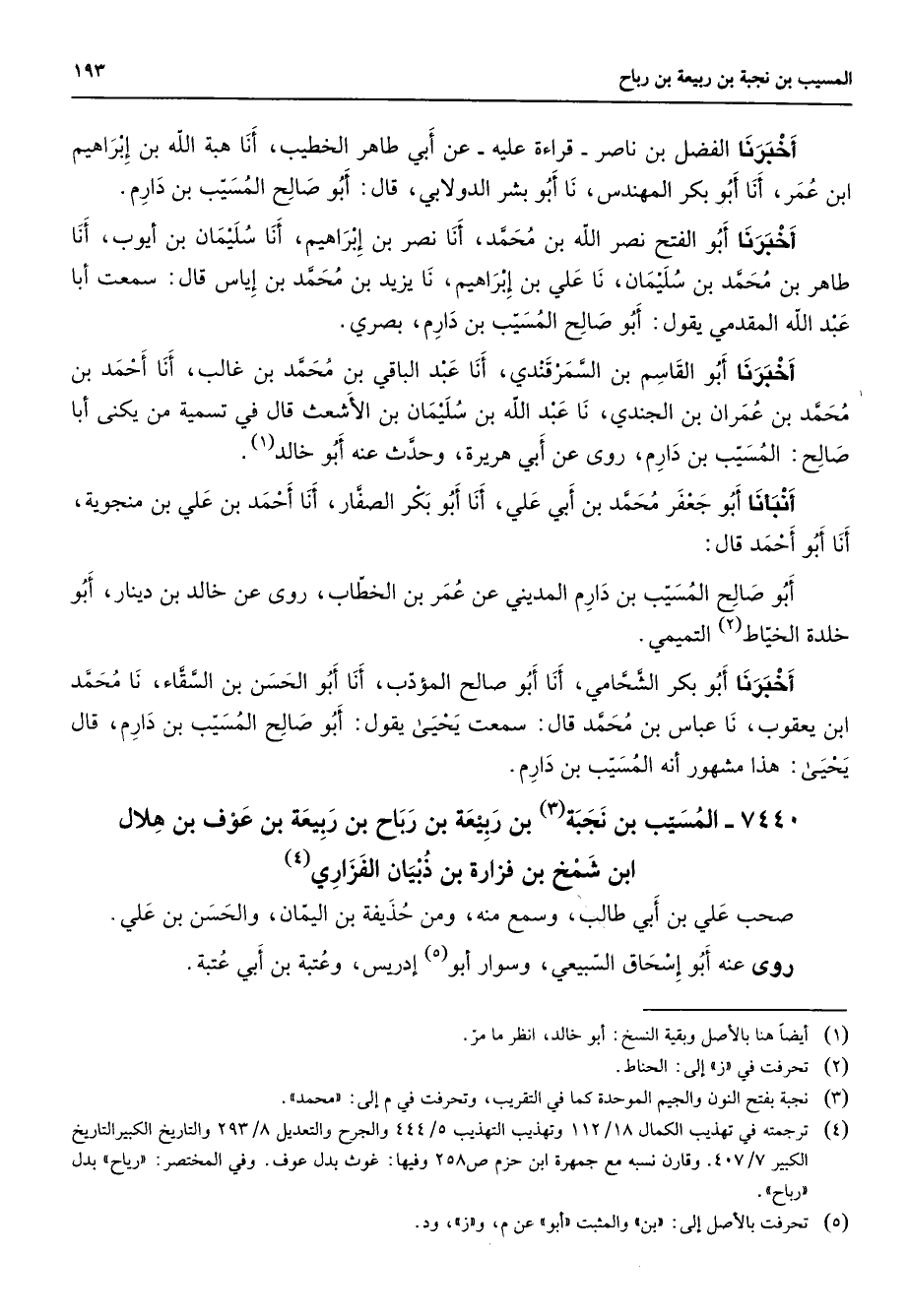 7440 - المسيب بن نجبة (3) بن ربيعة بن رباح بن ربيعة بن عوف بن هلال ابن شمخ بن فزارة بن ذبيان الفزاري (4) صحب علي بن أبي طالب وسمع منه ومن حذيفة بن اليمان والحسن بن علي روى عنه أبو إسحاق السبيعي وسوار أبو (5) إدريس وعتبة بن أبي عتبة