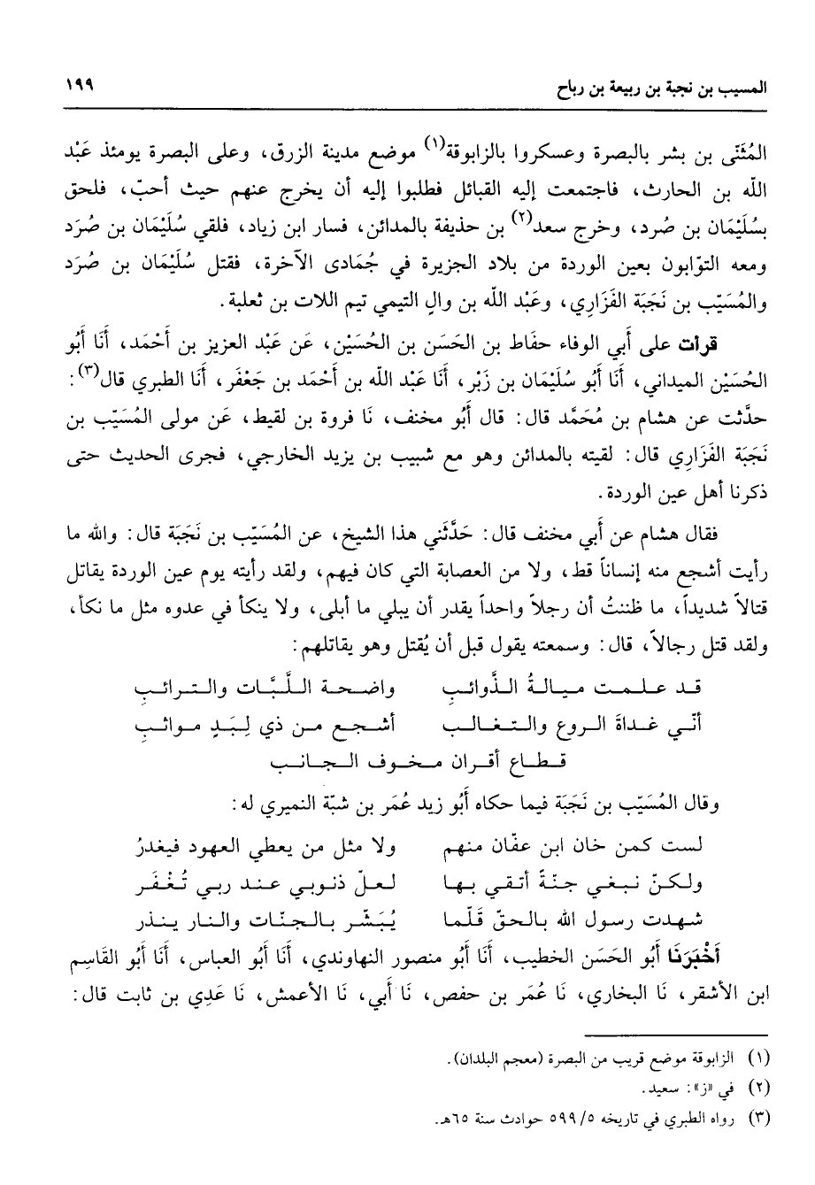 المثنى بن بشر بالبصرة وعسكروا بالزابوقة (1) موضع مدينة الزرق وعلى البصرة يومئذ عبد الله بن الحارث فاجتمعت إليه القبائل فطلبوا إليه أن يخرج عنهم حيث أحب فلحق بسليمان بن صرد وخرج سعد (2) بن حذيفة بالمدائن فسار ابن زياد فلقي سليمان بن صرد ومعه التوابون بعين الوردة من بلاد الجزيرة في جمادى الآخرة فقتل سليمان بن صرد والمسيب بن نجبة الفزاري وعبد الله بن وال التيمي تيم اللات بن ثعلبة قرأت على أبي الوفاء حفاط بن الحسن بن الحسين عن عبد العزيز بن أحمد أنا أبو الحسين الميداني أنا أبو سليمان بن زبر أنا عبد الله بن أحمد بن جعفر أنا الطبري قال (3) حدثت عن هشام بن محمد قال قال أبو مخنف نا فروة بن لقيط عن مولى المسيب بن نجبة الفزاري قال لقيته بالمدائن وهو مع شبيب بن يزيد الخارجي فجرى الحديث حتى ذكرنا أهل عين الوردة فقال هشام عن أبي مخنف قال حدثني هذا الشيخ عن المسيب بن نجبة قال والله ما رأيت أشجع منه إنسانا قط ولا من العصابة التي كان فيهم ولقد رأيته يوم عين الوردة يقاتل قتالا شديدا ما ظننت أن رجلا واحدا يقدر أنا يبلي ما أبلى ولا ينكأ في عدوه مثل ما نكأ ولقد قتل رجالا قال وسمعته يقول قبل أن يقتل وهو يقاتلهم * قد علمت ميالة الذوائب * واضحة اللبات والترائب أني غداة الروع والتغالب * أشجع من ذي لبد مواثب قطاع أقران مخوف الجانب وقال المسيب بن نجبة فيما حكاه أبو زيد عمر بن شبة النميري له * لست كمن خان ابن عفان منهم * ولا مثل من يعطي العهود فيغدر ولكن نبغي جنة أتقي بها * لعل ذنوبي عند ربي تغفر شهدت رسول الله بالحق قلما * يبشر بالجنات والنار ينذر * أخبرنا أبو الحسن الخطيب أنا أبو منصور النهاوندي أنا أبو العباس أنا أبو القاسم ابن الأشقر نا البخاري نا عمر بن حفص نا أبي نا الأعمش نا عدي بن ثابت قال