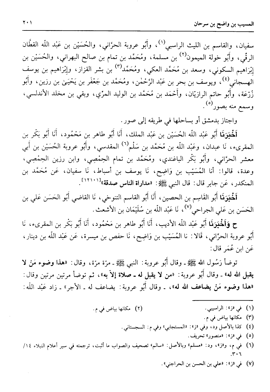 سفيان والقاسم بن الليث الراسبي (1) وأبو عروبة الحراني والحسين بن عبد الله القطان الرقي وأبو خولة الميمون (2) بن مسلمة ومحمد بن تمام بن صالح البهراني والحسين بن إبراهيم السكوني وسعد بن محمد العكي ومحمد (3) بن بشر القزاز وإبراهيم بن يوسف الهسجاني (4) ويوسف بن بحر بن عبد الرحمن ومحمد بن جعفر بن يحيى بن رزين وأبو زرعة وأبو حاتم الرازيان وأحمد بن محمد بن الوليد المري وبقي بن مخلد الأندلسي وسمع منه بصور (5) واجتاز بدمشق أو بساحلها في طريقه إلى صور أخبرنا أبو عبد الله الحسين بن عبد الملك أنا أبو طاهر بن محمود أنا أبو بكر بن المقرئ نا عبدان وعبد الله بن محمد بن سلم (6) المقدسي وأبو عروبة الحسين بن أبي معشر الحراني وأبو بكر الباغندي ومحمد بن تمام الحمصي وابن رزين الحمصي وعدة قالوا أنا المسيب بن واضح نا يوسف بن أسباط نا سفيان عن محمد بن المنكدر عن جابر قال قال النبي (صلى الله عليه وسلم) مداراة الناس صدقة أخبرنا أبو القاسم بن الحصين أنا أبو القاسم التنوخي نا القاضي أبو الحسن علي بن الحسن بن علي الجراحي (7) نا عبد الله بن سليمان بن الأشعث ح وأخبرنا أبو عبد الله الأديب أنا أبو طاهر بن محمد أنا أبو بكر بن المقرئ نا أبو عروبة الحراني قالا نا المسيب بن واضح نا حفص بن ميسرة عن عبد الله بن دينار عن ابن عمر قال توضأ رسول الله (صلى الله عليه وسلم) وقال أبو عروبة النبي (صلى الله عليه وسلم) مرة مرة وقال هذا وضوء من لا يقبل الله له وقال أبو عروبة من لا يقبل له صلاة إلا به ثم توضأ مرتين مرتين وقال هذا وضوء من يضاعف الله له وقال أبو عروبة يضاعف له الأجر زاد عبد الله
