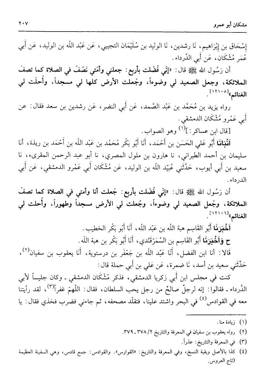 إسحاق بن إبراهيم نا رشدين نا الوليد بن سليمان التجيبي عن عبد الله بن الوليد عن أبي عمر مشكان عن أبي الدرداء أن رسول الله (صلى الله عليه وسلم) قال إني فضلت بأربع جعلني وأمتي نصف في الصلاة كما تصف الملائكة وجعل الصعيد لي وضوءا وجعلت الأرض كلها لي مسجدا وأحلت لي الغنائم رواه يزيد بن محمد بن عبد الصمد عن أبي النضر عن رشدين بن سعد فقال عن أبي عمرو مشكان الدمشقي قال ابن عساكر (1) وهو الصواب أنبأنا أبو علي الحسن بن أحمد أنا أبو بكر محمد بن عبد الله بن أحمد بن ريذة أنا سليمان بن أحمد الطبراني نا هارون بن ملول المصري نا أبو عبد الرحمن المقرئ نا سعيد بن أبي أيوب حدثني عبيد الله بن الوليد عن مشكان أبي عمرو الدمشقي عن أبي الدرداء أن رسول الله (صلى الله عليه وسلم) قال إني فضلت بأربع جعلت أنا وأمتي في الصلاة كما تصف الملائكة وجعل الصعيد لي وضوءا وجعلت لي الأرض مسجدا وطهورا وأحلت لي الغنائم أخبرنا أبو القاسم هبة الله بن عبد الله أنا أبو بكر الخطيب ح وأخبرنا أبو القاسم بن السمرقندي أنا أبو بكر بن هبة الله قالا أنا ابن الفضل أنا عبد الله بن جعفر بن درستوية أنا يعقوب بن سفيان (2) حدثني سعيد بن أسد نا ضمرة عن علي بن أبي حملة قال كنت في مجلس ابن أبي زكريا الدمشقي فذكر مشكان الدمشقي وكان جليسا لأبي الدرداء فقالوا إنه لرجل صالح من رجل يحب السلطان فقال اللهم غفرا (3) لقد رأيتنا معه في القوادس (4) في البحر واشتد علينا فتقلد مصحفه ثم جاءني فضرب فخذي فقال يا