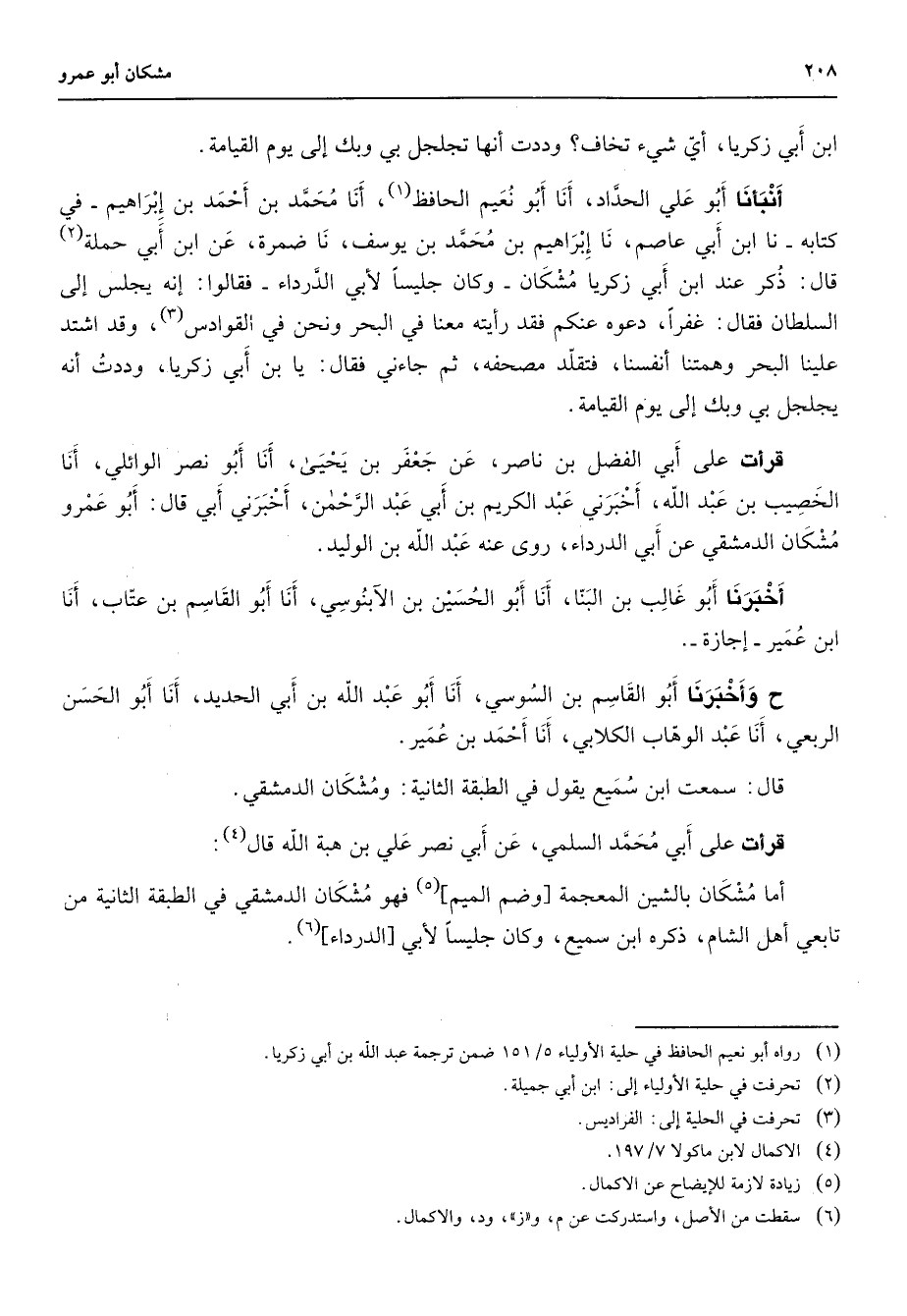 ابن أبي زكريا أي شئ تخاف وددت أنها تجلجل بي وبك إلى يوم القيامة أنبأنا أبو علي الحداد أنا أبو نعيم الحافظ (1) أنا محمد بن أحمد بن إبراهيم في كتابه نا ابن أبي عاصم نا إبراهيم بن محمد بن يوسف نا ضمرة عن ابن أبي حملة (2) قال ذكر عند ابن أبي زكريا مشكان وكان جليسا لأبي الدرداء فقالوا إنه يجلس إلى السلطان فقال غفرا دعوه عنكم فقد رأيته معنا في البحر ونحن في القوادس (3) وقد اشتد علينا البحر وهمتنا أنفسنا فتقلد مصحفه ثم جاءني فقال يا بن أبي زكريا وددت أنه يجلجل بي وبك إلى يوم القيامة قرأت على أبي الفضل بن ناصر عن جعفر بن يحيى أنا أبو نصر الوائلي أنا الخصيب بن عبد الله أخبرني عبد الكريم بن أبي عبد الرحمن أخبرني أبي قال أبو عمرو مشكان الدمشقي عن أبي الدرداء روى عنه عبد الله بن الوليد أخبرنا أبو غالب بن البنا أنا أبو الحسين بن الآبنوسي أنا أبو القاسم بن عتاب أنا ابن عمير إجازة ح وأخبرنا أبو القاسم بن السوسي أنا أبو عبد الله بن أبي الحديد أنا أبو الحسن الربعي أنا عبد الوهاب الكلابي أنا أحمد بن عمير قال سمعت ابن سميع يقول في الطبقة الثانية ومشكان الدمشقي قرأت على أبي محمد السلمي عن أبي نصر علي بن هبة الله قال (4) أما مشكان بالشين المعجمة وضم الميم (5) فهو مشكان الدمشقي في الطبقة الثانية من تابعي أهل الشام ذكره ابن سميع وكان جليسا لأبي الدرداء (6)