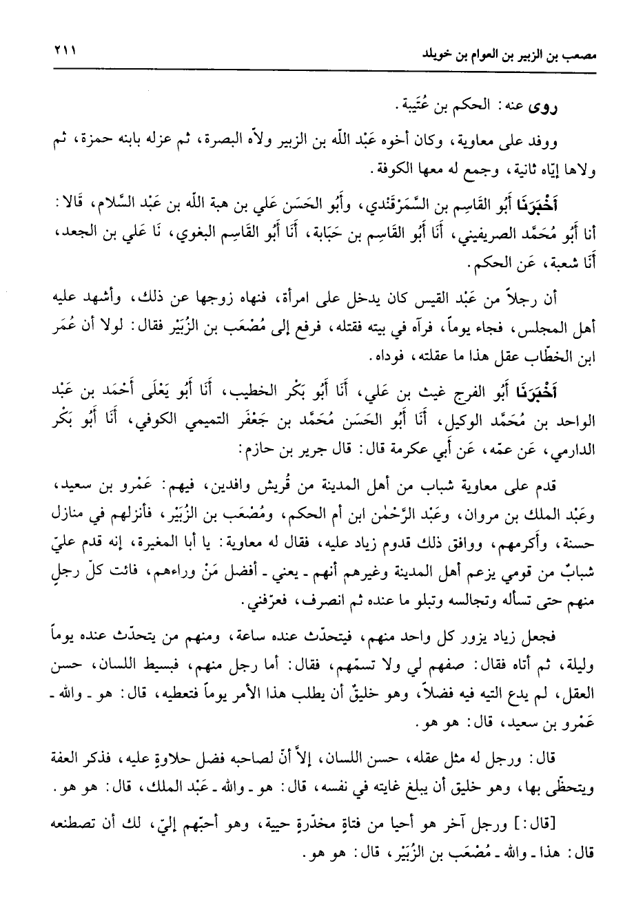 روى عنه الحكم بن عتيبة ووفد على معاوية وكان أخوه عبد الله بن الزبير ولاه البصيرة ثم عزله بابنه حمزة ثم ولاها إياه ثانية وجمع له معها الكوفة أخبرنا أبو القاسم بن السمر قندي وأبو الحسن علي بن هبة الله بن عبد السلام قالا أنا أبو محمد الصريفيني أنا أبو القاسم بن حبابة أنا أبو القاسم البغوي نا علي بن الجعد أنا شعبة عن الحكم أن رجلا من عبد القيس كان يدخل على امرأة فنهاه زوجها عن ذلك وأشهد عليه أهل المجلس فجاء يوما فرآه في بيته فقتله فرفع إلى مصعب بن الزبير فقال لولا أن عمر ابن الخطاب عقل هذا ما عقلته فوداه أخبرنا أبو الفرج غيب بن علي أنا أبو بكر الخطيب أنا أبو يعلى أحمد بن عبد الواحد بن محمد الوكيل أنا أبو الحسن محمد بن جعفر التميمي الكوفي أنا أبو بكر الدارمي عن عمه عن أبي عكرمة قال قال جرير بن حازم قدم على معاوية شباب من أهل المدينة من قريش وافدين فيهم عمرو بن سعيد وعبد الملك بن مروان وعبد الرحمن ابن أم الحكم ومصعب بن الزبير فأنزلهم في منازل حسنة وأكرمهم ووافق ذلك قدوم زياد عليه فقال له معاوية يا أبا المغيرة إنه قدم علي شباب من قومي يزعم أهل المدينة وغيرهم أنهم يعني أفضل من وراءهم فائت كل رجل منهم حتى تسأله وتجالسه وتبلو ما عنده ثم انصرف فعرفني فجعل زياد يزور كل واحد منهم فيتحدث عنده ساعة ومنهم من يتحدث عنده يوما وليلة ثم أتاه فقال صفهم لي ولا تسمهم فقال أما رجل منهم فبسيط اللسان حسن العقل لم يدع التيه فيه فضلا وهو خليق أن يطلب هذا الأمر يوما فتعطيه قال هو والله عمرو بن سعيد قال هو هو قال ورجل له مثل عقله حسن اللسان إلا أن لصاحبه فضل حلاوة عليه فذكر العفة ويتحظى بها وهو خليق أن يبلغ غايته في نفسه قال هو والله عبد الملك قال هو هو قال ورجل آخر هو أحيا من فتاة مخدرة حيية وهو أحبهم إلي لك أن تصطنعه قال هذا والله مصعب بن الزبير قال هو هو