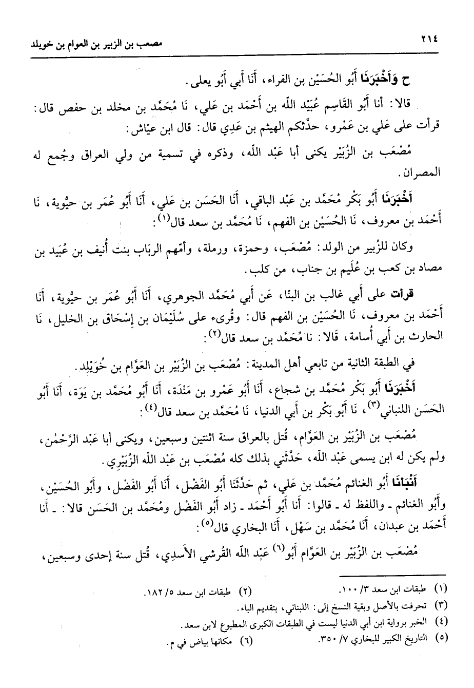 ح وأخبرنا أبو الحسين بن الفراء أنا أبي أبو يعلى قالا أنا أبو القاسم عبيد الله بن أحمد بن علي نا محمد بن مخلد بن حفص قال قرأت على علي بن عمرو حدثكم الهيثم بن عدي قال قال ابن عياش مصعب بن الزبير يكنى أبا عبد الله وذكره في تسمية من ولي العراق وجمع له المصران أخبرنا أبو بكر محمد بن عبد الباقي أنا الحسن بن علي أنا أبو عمر بن حيوية نا أحمد بن معروف نا الحسين بن الفهم نا محمد بن سعد قال (1) وكان للزبير من الولد مصعب وحمزة ورملة وأمهم الرباب بنت أنيف بن عبيد بن مصاد بن كعب بن عليم بن جناب من كلب قرأت على أبي غالب بن البنا عن أبي محمد الجوهري أنا أبو عمرو بن حيوية أنا أحمد بن معروف نا الحسين بن الفهم قال وقرئ على سليمان بن إسحاق بن الخليل نا الحارث بن أبي أسامة قالا نا محمد بن سعد قال (2) في الطبقة الثانية من تابعي أهل المدينة مصعب بن الزبير بن العوام بن خويلد أخبرنا أبو بكر محمد بن شجاع أنا أبو عمرو بن مندة أنا أبو محمد بن يوة أنا أبو الحسن اللنباني (3) نا أبو بكر بن أبي الدنيا نا محمد بن سعد قال (4) مصعب بن الزبير بن العوام قتل بالعراق سنة اثنتين وسبعين ويكنى أبا عبد الرحمن ولم يكن له ابن يسمى عبد الله حدثني بذلك كله مصعب بن عبد الله الزبيري أنبأنا أبو الغنائم محمد بن علي ثم حدثنا أبو الفضل أنا أبو الفضل وأبو الحسين وأبو الغنائم واللفظ له قالوا أنا أبو أحمد زاد أبو الفضل ومحمد بن الحسن قالا أنا أحمد بن عبدان أنا محمد بن سهل أنا البخاري قال (5) مصعب بن الزبير بن العوام أبو (6) عبد الله القرشي الأسدي قتل سنة إحدى وسبعين