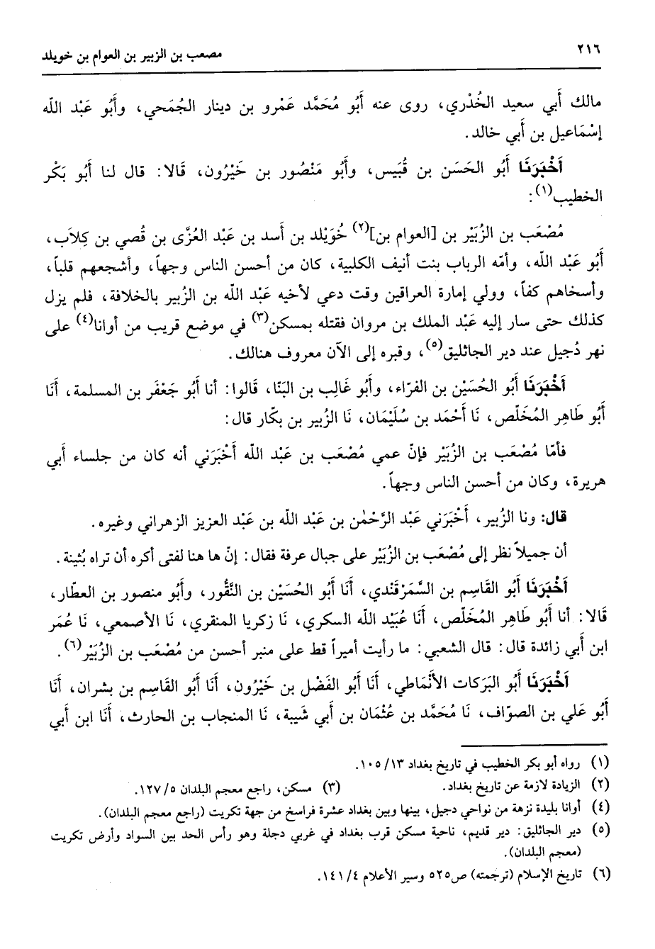 مالك أبي سعيد الخدري روى عنه أبو محمد عمرو بن دينار الجمحي وأبو عبد الله إسماعيل بن أبي خالد أخبرنا أبو الحسن بن قبيس وأبو منصور بن خيرون قالا قال لنا أبو بكر الخطيب (1) مصعب بن الزبير بن العوام بن (2) خويلد بن أسد بن عبد العزى بن قصي بن كلاب أبو عبد الله وأمه الرباب بنت أنيف الكلبية كان من أحسن الناس وجها وأشجعهم قلبا وأسخاهم كفا وولي إمارة العراقين وقت دعي لأخيه عبد الله بن الزبير بالخلافة فلم يزل كذلك حتى سار إليه عبد الملك بن مروان فقتله بمسكن (3) في موضع قريب من أوانا (4) على نهر دجيل عند دير الجاثليق (5) وقبره إلى الآن معروف هنالك أخبرنا أبو الحسين بن الفراء وأبو غالب بن البناء قالوا أنا أبو جعفر بن المسلمة أنا أبو طاهر المخلص نا أحمد بن سليمان نا الزبير بن بكار قال فأما مصعب بن الزبير فإن عمي مصعب بن عبد الله أخبرني أنه كان من جلساء أبي هريرة وكان من أحسن الناس وجها قال ونا الزبير أخبرني عبد الرحمن بن عبد الله بن عبد العزيز الزهراني وغيره أن جميلا نظر إلى مصعب بن الزبير على جبال عرفة فقال إن ها هنا لفتى أكره أن تراه بثينة أخبرنا أبو القاسم بن السمرقندي أنا أبو الحسين بن النقور وأبو منصور بن العطار قالا أنا أبو طاهر المخلص أنا عبيد الله السكري نا زكريا المنقري نا الأصمعي نا عمر ابن أبي زائدة قال قال الشعبي ما رأيت أميرا قط على منبر أحسن من مصعب بن الزبير (6) أخبرنا أبو البركات الأنماطي أنا أبو الفضل بن خيرون أنا أبو القاسم بن بشران أنا أبو علي بن الصواف نا محمد بن عثمان بن أبي شيبة نا المنجاب بن الحارث أنا ابن أبي