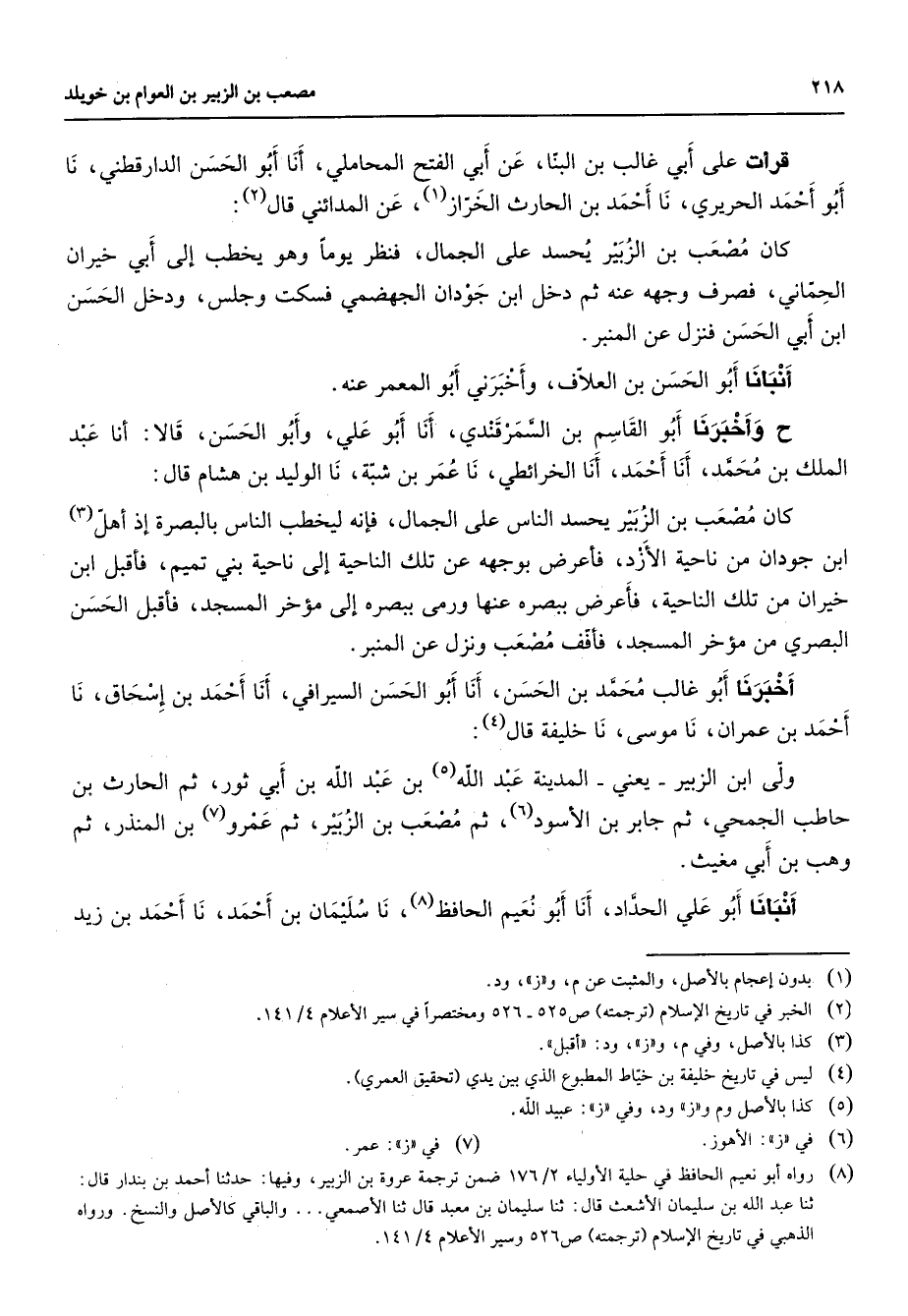 قرأت على أبي غالب بن البنا عن أبي الفتح المحاملي أنا أبو الحسن الدارقطني نا أبو أحمد الحريري نا أحمد بن الحارث الخراز (1) عن المدائني قال (2) كان مصعب بن الزبير يحسد على الجمال فنظر يوما وهو يخطب إلى أبي خيران الحماني فصرف وجهه عنه ثم دخل ابن جودان الجهضمي فسكت وجلس ودخل الحسن ابن أبي الحسن فنزل عن المنبر أنبأنا أبو الحسن بن العلاف وأخبرني أبو المعمر عنه ح وأخبرنا أبو القاسم بن السمرقندي أنا أبو علي وأبو الحسن قالا أنا عبد الملك بن محمد أنا أحمد أنا الخرائطي نا عمر بن شبة نا الوليد بن هشام قال كان مصعب بن الزبير يحسد الناس على الجمال فإنه ليخطب الناس بالبصرة إذ أهل (3) ابن جودان من ناحية الأزد فأعرض بوجهه عن تلك الناحية إلى ناحية بني تميم فأقبل ابن خيران من تلك الناحية فأعرض ببصره عنها ورمى ببصره إلى مؤخر المسجد فأقبل الحسن البصري من مؤخر المسجد فأفف مصعب ونزل عن المنبر أخبرنا أبو غالب محمد بن الحسن أنا أبو الحسن السيرافي أنا أحمد بن إسحاق نا أحمد بن عمران نا موسى نا خليفة قال (4) ولى ابن الزبير يعني المدينة عبد الله (5) بن عبد الله بن أبي ثور ثم الحارث بن حاطب الجمحي ثم جابر بن الأسود (6) عن مصعب بن الزبير ثم عمرو (7) بن المنذر ثم وهب بن أبي مغيث أنبأنا أبو علي الحداد أنا أبو نعيم الحافظ (8) نا سليمان بن أحمد نا أحمد بن زيد