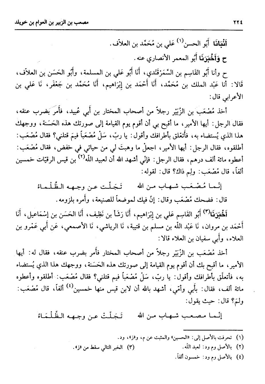 أنبأنا أبو الحسن (1) علي بن محمد بن العلاف ح وأخبرنا أبو المعمر الأنصاري عنه ح وأنا أبو القاسم بن السمرقندي أنا أبو علي بن المسلمة وأبو الحسن بن العلاف قالا أنا عبد الملك بن محمد أنا أحمد بن إبراهيم أنا محمد بن جعفر نا علي بن الأعرابي قال أخذ مصعب بن الزبير رجلا من أصحاب المختار بن أبي عبيد فأمر بضرب عنقه فقال الرجل أيها الأمير ما أقبح بي أن أقوم يوم القيامة إلى صورتك هذه الحسنة ووجهك هذا الذي يستضاء به فأتعلق بأطرافك وأقول يا رب سل مصعبا فيم قتلني فقال مصعب أطلقوه فقال الرجل أيها الأمير اجعل ما وهبت لي من حياتي في خفض فقال مصعب أعطوه مائة ألف درهم فقال الرجل فإني أشهد الله أن لعبيد الله (2) بن قيس الرقيات خمسين ألفا قال مصعب ولم ذاك قال لقوله * إنما مصعب شهاب من الله * تجلت عن وجهه الظلماء * قال فضحك مصعب وقال إن فيك لموضعا للصنيعة وأمره بلزومه أخبرنا (3) أبو القاسم علي بن إبراهيم أنا رشأ بن نظيف أنا الحسن بن إسماعيل أنا أحمد بن مروان نا عبد الله بن مسلم بن قتيبة نا الرياشي نا الأصمعي عن أبي عمرو بن العلاء وابي سفيان بن العلاء قالا أخذ مصعب بن الزبير رجلا من أصحاب المختار فأمر بضرب عنقه فقال له أيها الأمير ما أقبح بك إن أقوم يوم القيامة إلى صورتك هذه الحسنة ووجهك هذا الذي يستضاء به فأتعلق بأطرافك وأقول يا رب سل مصعبا فيم يقتلني فقال مصعب أطلقوه وأعطوه مائة ألف فقال بأبي وامي أشهد بالله أن لابن قيس منها خمسين (4) ألفا قال مصعب ولم قال حيث يقول * إنما مصعب شهاب من الله * تجلت عن وجهه الظلماء *