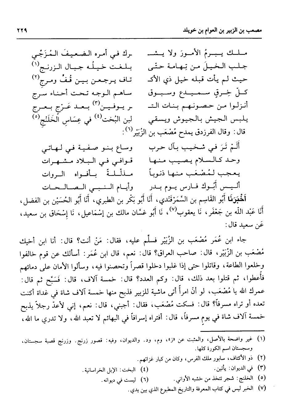 ملك يبرم الأمور ولا يش * رك في أمره الضعيف المزجي جلب الخيل من تهامة حتى * بلغت خيله جبال الزرنج (1) حيث لم يأت قبله خيل ذي الأك * تاف يرجعن بين قف ومرج (2) كل خرق سميدع وسبوق * ساهم الوجه تحت أحناء سرج أنزلوا من حصونهم بنات الت * ر يوفين (3) بعد عرج بعرج يلبس الجيش بالجيوش ويسقي * لبن البخت (4) في عساس الخلنج (5) * قال وقال الفرزدق يمدح مصعب بن الزبير (6) * ألم تر في شخيب بآل حرب * وساع بنو صفية في لهاتي وحد كالسلام يصيب منها * قوافي في البلاد مشهرات يعجب لمصعب منها ذنوبا * مذللة بأفواه الروات أليس أبوك فارس يوم بدر * وأيام النبي الصالحات * أخبرنا أبو القاسم بن السمرقندي أنا أبو بكر بن الطبري أنا أبو الحسين بن الفضل أنا عبد الله بن جعفر نا يعقوب (7) نا أبو غسان مالك بن إسماعيل نا إسحاق بن سعيد عن سعيد قال جاء ابن عمر مصعب بن الزبير فسلم عليه فقال من أنت قال أنا ابن أخيك مصعب بن الزبير قال صاحب العراق قال نعم قال ابن عمر أسألك عن قوم خالفوا وخلعوا الطاعة وقاتلوا حتى إذا غلبوا دخلوا قصرا وتحصنوا فيه وسألوا الأمان على دمائهم فأعطوا ثم قتلوا بعد ذلك قال وكم العدد قال خمسة آلاف قال فسبح ثم قال عمرك الله يا مصعب لو أن امرأ أتى ماشية للزبير فذبح منها خمسة آلاف شاة في غداة أكنت تعده أو تراه مسرفا قال فسكت مصعب فقال أجبني قال نعم إني لأعد رجلا يذبح خمسة آلاف شاة في يوم مسرفا قال أفتراه إسرافا في البهائم لا تعبد الله ولا تدري ما الله