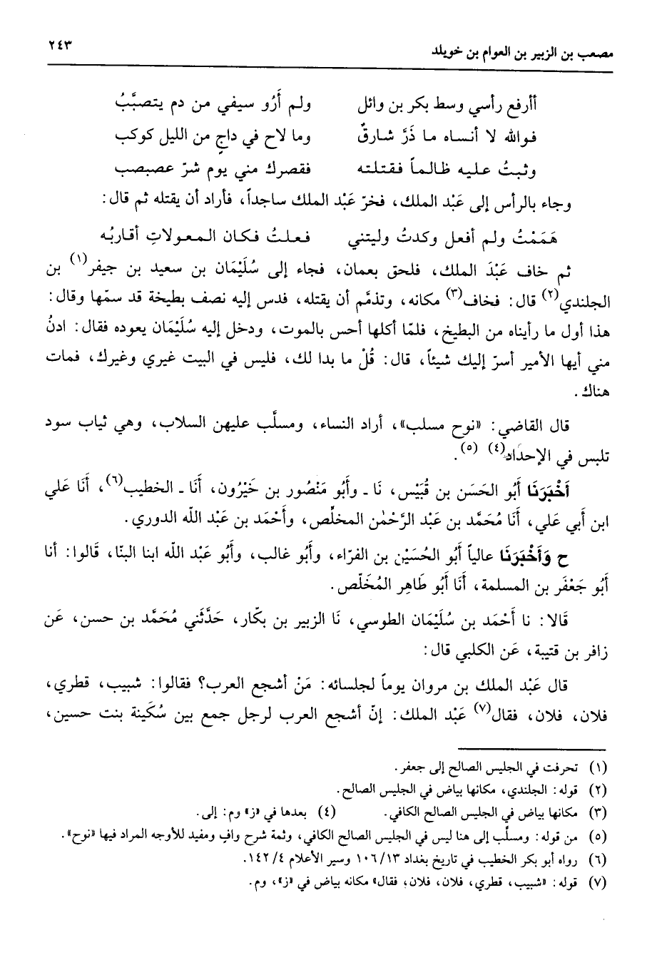 أأرفع رأسي وسط بكر بن وائل * ولم أرو سيفي من دم يتصبب فوالله لا أنساه ما ذر شارق * وما لاح في داج من الليل كوكب وثبت عليه ظالما فقتلته * فقصرك مني يوم شر عصبصب * وجاء بالرأس إلى عبد الملك فخر عبد الملك ساجدا فأراد أن يقتله ثم قال * هممت ولم أفعل وكدت وليتني * فعلت فكان المعولات أقاربه * ثم خاف عبد الملك فلحق بعمان فجاء إلى سليمان بن سعيد بن جيفر (1) بن الجلندي (2) قال فخاف (3) مكانه وتذمم أن يقتله فدس إليه نصف بطيخة قد سمها وقال هذا أول ما رأيناه من البطيخ فلما أكلها أحس بالموت ودخل إليه سليمان يعوده فقال ادن مني أيها الأمير أسر إليك شيئا قال قل ما بدا لك فليس في البيت غيري وغيرك فمات هناك قال القاضي نوح مسلب أراد النساء ومسلب عليهن السلاب وهي ثياب سود تلبس في الإحداد (4) (5) أخبرنا أبو الحسن بن قبيس نا وأبو منصور بن خيرون أنا الخطيب (6) أنا علي ابن أبي علي أنا محمد بن عبد الرحمن المخلص وأحمد بن عبد الله الدوري ح وأخبرنا عاليا أبو الحسين بن الفراء وأبو غالب وأبو عبد الله ابنا البنا قالوا أنا أبو جعفر بن المسلمة أنا أبو طاهر المخلص قالا نا أحمد بن سليمان الطوسي نا الزبير بن بكار حدثني محمد بن حسن عن زافر بن قتيبة عن الكلبي قال قال عبد الملك بن مروان يوما لجلسائه من أشجع العرب فقالوا شبيب قطري فلان فلان فقال (7) عبد الملك إن أشجع العرب لرجل جمع بين سكينة بنت حسين