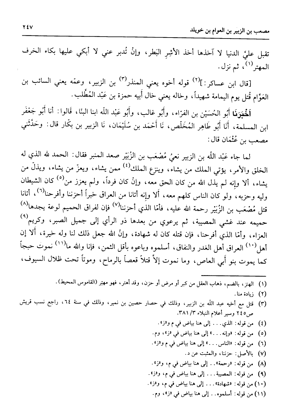 (3) قتل مع أخيه عبد الله بن الزبير وذلك في حصار حصين بن نمير وذلك في سنة 64، راجع نسب قريش ص 245 وسير أعلام النبلاء 3 / 381