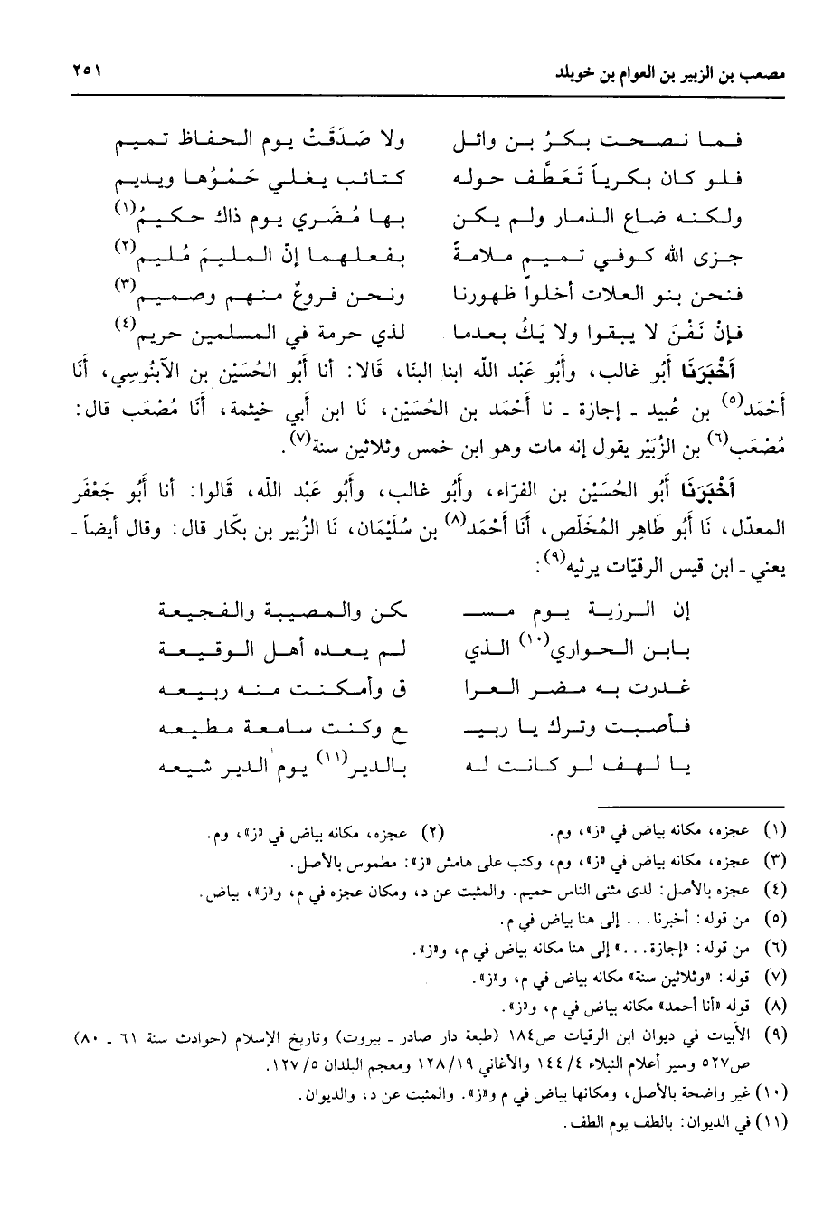 (9) الابيات في ديوان ابن الرقيات ص 184 (طبعة دار صادر - بيروت) وتاريخ الاسلام (حوادث سنة 61 - 80) ص 527 وسير أعلام النبلاء 4 / 144 والاغاني 19 / 128 ومعجم البلدان 5 / 127