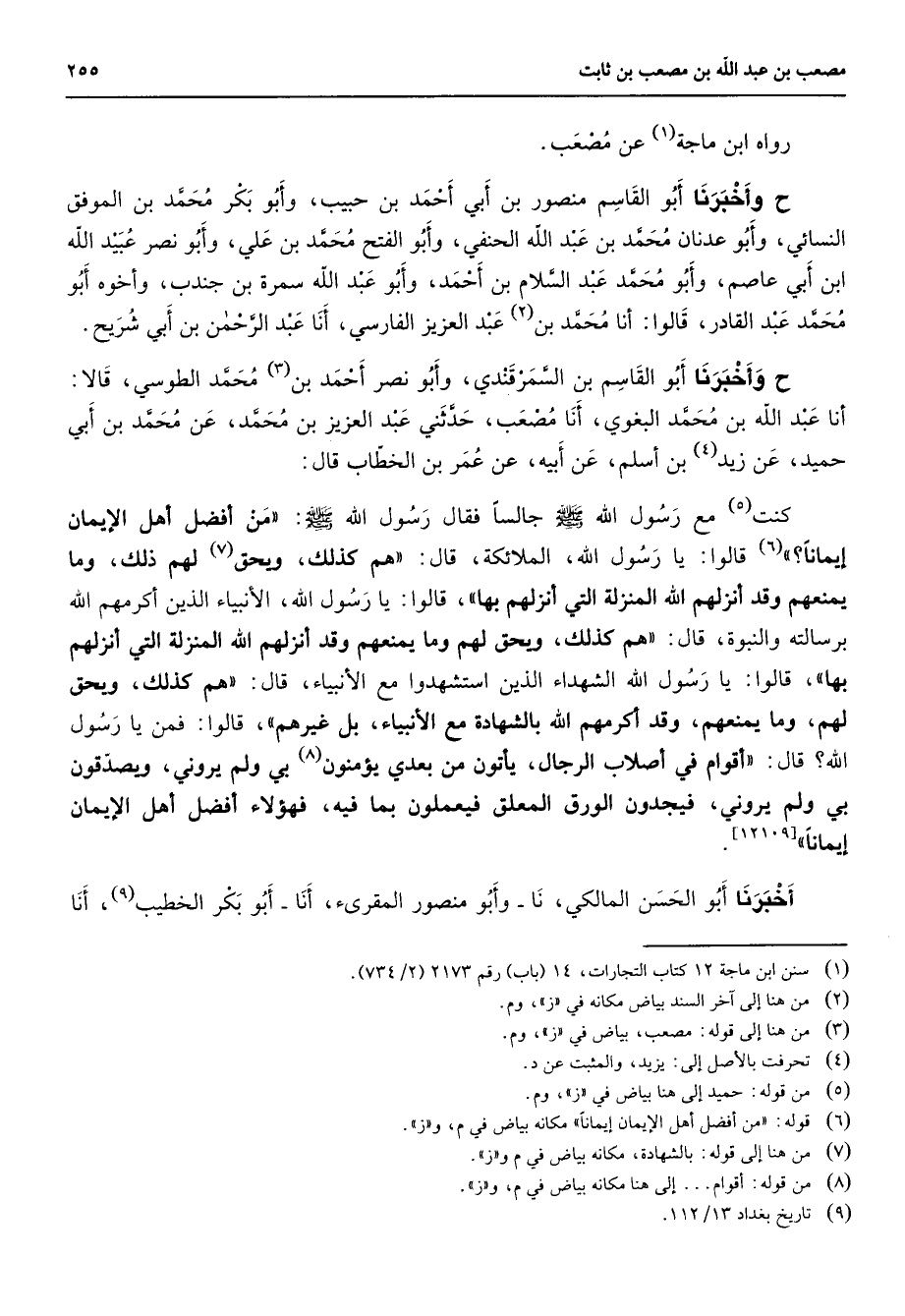 رواه ابن ماجه (1) عن مصعب ح وأخبرنا أبو القاسم منصور بن أبي أحمد بن حبيب وأبو بكر محمد بن الموفق النسائي وأبو عدنان محمد بن عبد الله الحنفي وأبو الفتح محمد بن علي وأبو نصر عبيد الله ابن أبي عاصم وأبو محمد عبد السلام بن أحمد وأبو عبد الله سمرة بن جندب وأخوه أبو محمد عبد القادر قالوا أنا محمد بن (2) عبد العزيز الفارسي أنا عبد الرحمن بن أبي شريح ح وأخبرنا أبو القاسم بن السمرقندي وأبو نصر أحمد بن (3) محمد الطوسي قالا أنا عبد الله بن محمد البغوي أنا مصعب حدثني عبد العزيز بن محمد عب محمد بن أبي حميد عن زيد (4) بن أسلم عن أبيه عن عمر بن الخطاب قال كنت (5) مع رسول الله (صلى الله عليه وسلم) جالسا فقال رسول الله (صلى الله عليه وسلم) من أفضل أهل الإيمان إيمانا (6) قالوا يا رسول الله الملائكة قال هم كذلك ويحق (7) لهم ذلك وما يمنعهم وقد أنزلهم الله المنزلة التي أنزلهم بها قالوا يا رسول الله الأنبياء الذين أكرمهم الله برسالته والنبوة قال هم كذلك ويحق لهم وما يمنعهم وقد أنزلهم الله المنزلة التي أنزلهم بها قالوا يا رسول الله الشهداء الذين استشهدوا مع الأنبياء قال هم كذلك ويحق لهم وما يمنعهم وقد أكرمهم الله بالشهادة مع الأنبياء بل غيرهم قالوا فمن يا رسول الله قال أقوام في أصلاب الرجال يأتون من بعدي يؤمنون (8) بي ولم يروني ويصدقون بي ولم يروني فيجدون الورق المعلق فيعملون بما فيه فهؤلاء أفضل أهل الإيمان إيمانا أخبرنا أبو الحسن المالكي نا وأبو منصور المقرئ أنا أبو بكر الخطيب (9) أنا