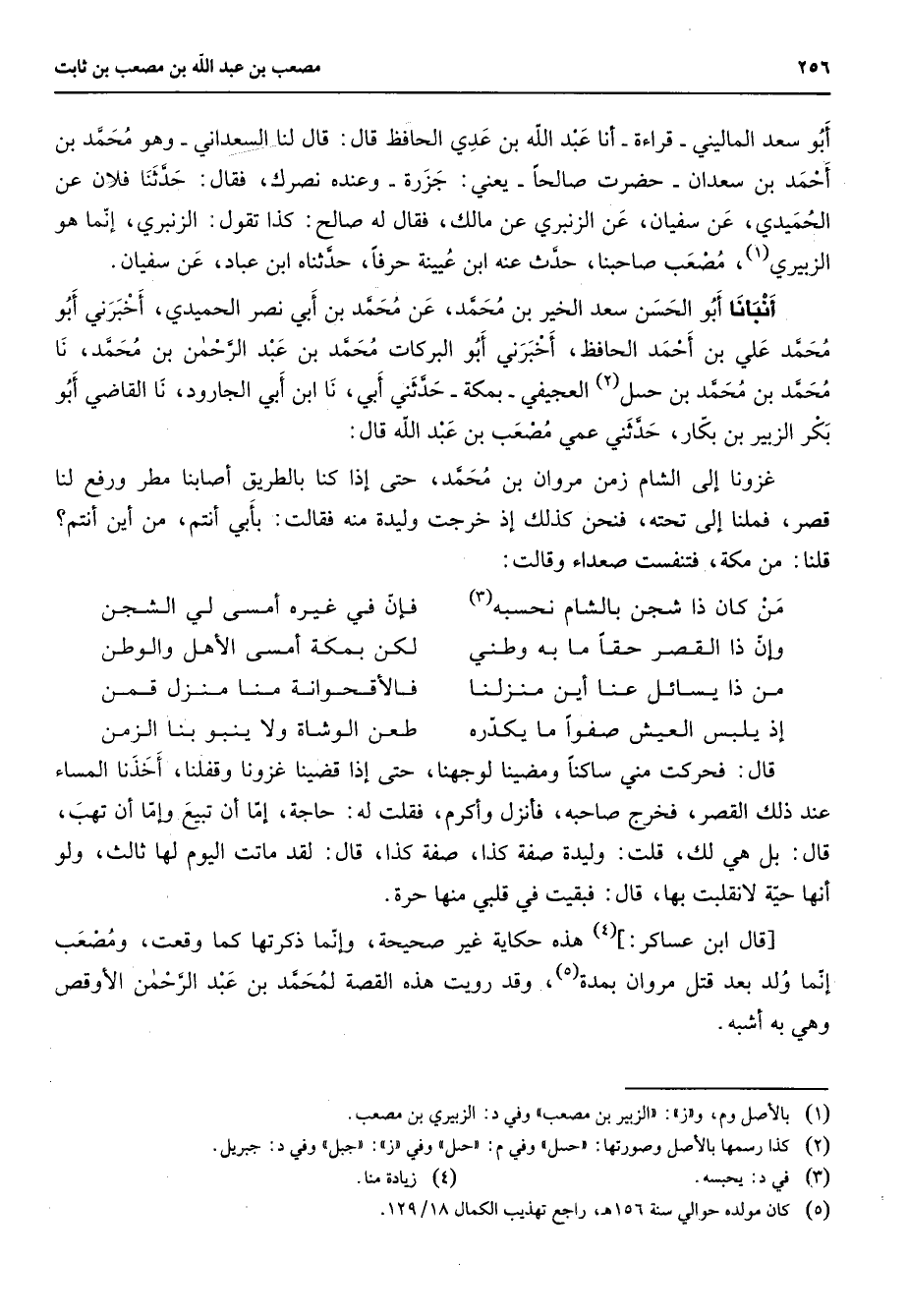 أبو سعد الماليني قراءة أنا عبد الله بن عدي الحافظ قال قال لنا السعداني وهو محمد بن أحمد بن سعدان حضرت صالحا يعني جزرة وعنده نصرك فقال حدثنا فلان عن الحميدي عن سفيان عن الزنبري عن مالك فقال له صالح كذا تقول الزنبري إنما هو الزبيري (1) مصعب صاحبنا حدث عنه ابن عيينة حرفا حدثناه ابن عباد عن سفيان أنبأنا أبو الحسن سعد الخير بن محمد عن محمد بن أبي نصر الحميدي أخبرني أبو محمد علي بن أحمد الحافظ أخبرني أبو البركات محمد بن عبد الرحمن بن محمد نا محمد بن محمد بن حسل (2) العجيفي بمكة حدثني أبي نا ابن أبي الجارود نا القاضي أبو بكر الزبير بن بكار حدثني عمي مصعب بن عبد الله قال غزونا إلى الشام زمن مروان بن محمد حتى إذا كنا بالطريق أصابنا مطر ورفع لنا قصر فملنا إلى تحته فنحن كذلك إذ خرجت وليدة منه فقالت بأبي أنتم من أين أنتم قلنا من مكة فتنفست صعداء وقالت * من كان ذا شجن بالشام نحسبه (3) * فإن في غيره أمسى لي الشجن وإن ذا القصر حقا ما به وطني * لكن بمكة أمسى الأهل والوطن من ذا يسائل عنا أين منزلنا * فالأقحوانة منا منزل قمن إذ يلبس العيش صفوا ما يكدره * طعن الوشاة ولا ينبو بنا الزمن * قال فحركت مني ساكنا ومضينا لوجهنا حتى إذا قضينا غزونا وقفلنا أخذنا المساء عند ذلك القصر فخرج صاحبه فأنزل وأكرم فقلت له حاجة إما أن تبيع وإما أن تهب قال بل هي لك قلت وليدة صفة كذا صفة كذا قال لقد ماتت اليوم لها ثالث ولو أنها حية لانقلبت بها قال فبقيت في قلبي منها حرة قال ابن عساكر (4) هذه حكاية غير صحيحة وإنما ذكرتها كما وقعت ومصعب إنما ولد بعد قتل مروان بمدة (5) وقد رويت هذه القصة لمحمد بن عبد الرحمن الأوقص وهي به أشبه
