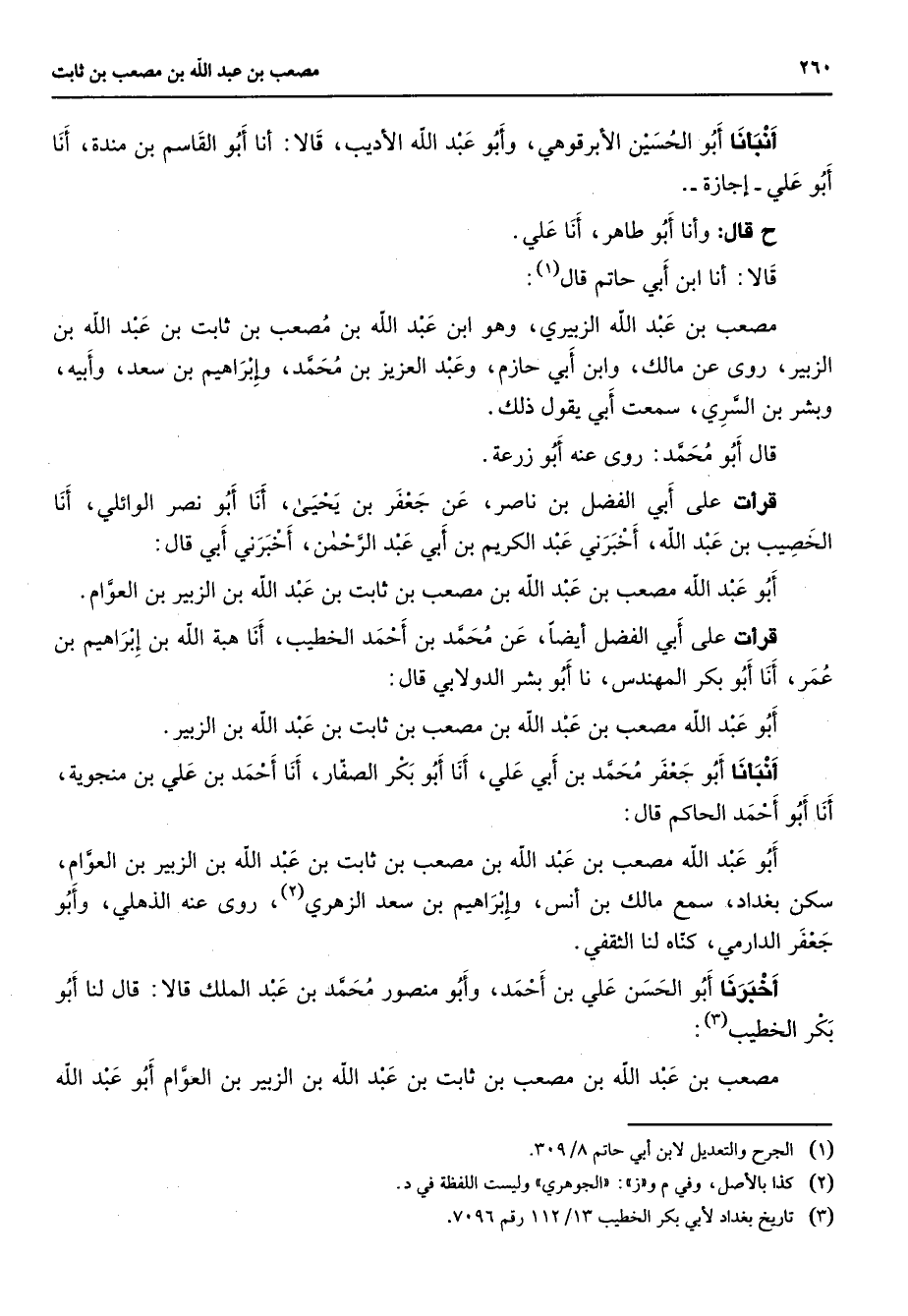 أنبأنا أبو الحسين الأبرقوهي وأبو عبد الله الأديب قالا أنا أبو القاسم بن مندة أنا أبو علي إجازة ح قال وأنا أبو طاهر أنا علي قالا أنا ابن أبي حاتم قال (1) مصعب بن عبد الله الزبيري وهو ابن عبد الله بن مصعب بن ثابت بن عبد الله بن الزبير روى عن مالك وابن أبي حازم وعبد العزيز بن محمد وإبراهيم بن سعد وأبيه وبشر بن السري سمعت أبي يقول ذلك قال أبو محمد روى عنه أبو زرعة قرأت على أبي الفضل بن ناصر عن جعفر بن يحيى أنا أبو نصر الوائلي أنا الخصيب بن عبد الله أخبرني عبد الكريم بن أبي عبد الرحمن أخبرني أبي قال أبو عبد الله مصعب بن عبد الله بن مصعب بن ثابت بن عبد الله بن الزبير بن العوام قرأت على أبي الفضل أيضا عن محمد بن أحمد الخطيب أنا هبة الله بن إبراهيم بن عمر أنا أبو بكر المهندس نا أبو بشر الدولابي قال أبو عبد الله مصعب بن عبد الله بن مصعب بن ثابت بن عبد الله بن الزبير أنبأنا أبو جعفر محمد بن أبي علي أنا أبو بكر الصفار أنا أحمد بن علي بن منجوية أنا أبو أحمد الحاكم قال أبو عبد الله مصعب بن عبد الله بن مصعب بن ثابت بن عبد الله بن الزبير بن العوام سكن بغداد سمع مالك بن أنس وإبراهيم بن سعد الزهري (2) روى عنه الذهلي وأبو جعفر الدارمي كناه لنا الثقفي أخبرنا أبو الحسن علي بن أحمد وأبو منصور محمد بن عبد الملك قالا قال لنا أبو بكر الخطيب (3) مصعب بن عبد الله بن مصعب بن ثابت بن عبد الله بن الزبير بن العوام أبو عبد الله