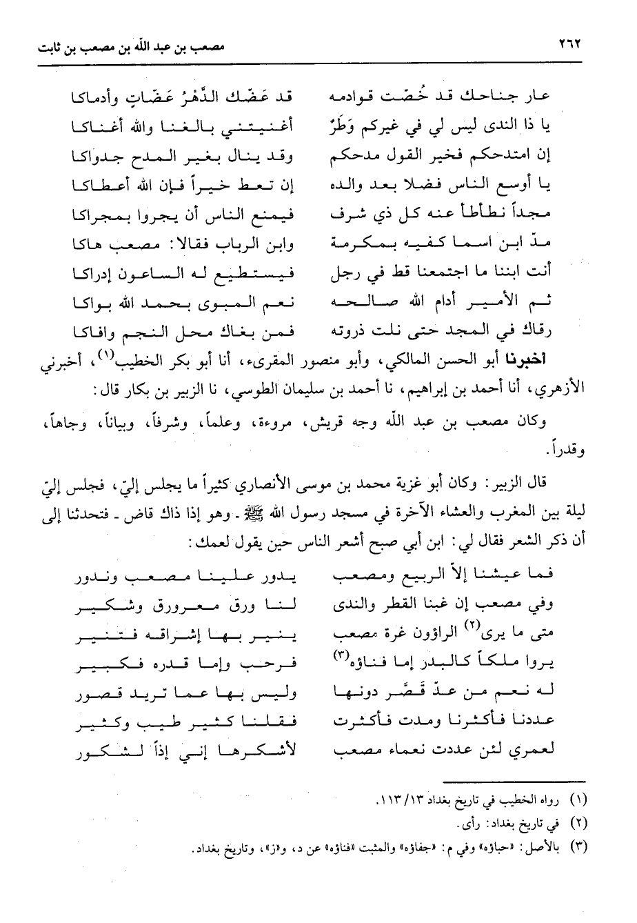 عار جناحك قد خصت قوادمه * قد عضك الدهر عضات وأدماكا يا ذا الندى ليس لي في غيركم وطر * أغنيتني بالغنا والله أغناكا إن امتدحكم فخير القول مدحكم * وقد ينال بغير المدح جدواكا يا أوسع الناس فضلا بعد والده * إن تعط خيرا فإن الله أعطاكا مجدا نطأطأ عنه كل ذي شرف * فيمنع الناس أن يجروا بمجراكا مد ابن اسما كفيه بمكرمة * وابن الرباب فقالا مصعب هاكا أنت ابننا ما اجتمعنا قط في رجل * فيستطيع له الساعون إدراكا ثم الأمير أدام الله صالحه * نعم المبوى بحمد الله بواكا رقاك في المجد حتى نلت ذروته * فمن بغاك محل النجم وافاكا * أخبرنا أبو الحسن المالكي وأبو منصور المقرئ أنا أبو بكر الخطيب (1) أخبرني الأزهري أنا أحمد بن إبراهيم نا أحمد بن سليمان الطوسي نا الزبير بن بكار قال وكان مصعب بن عبد الله وجه قريش مروءة وعلما وشرفا وبيانا وجاها وقدرا قال الزبير وكان أبو غزية محمد بن موسى الأنصاري كثيرا ما يجلس إلي فجلس إلي ليلة بين المغرب والعشاء الآخرة في مسجد رسول الله (صلى الله عليه وسلم) وهو إذ ذاك قاض فتحدثنا إلى أن ذكر الشعر فقال لي ابن أبي صبح أشعر الناس حين يقول لعمك * فما عيشنا إلا الربيع ومصعب * يدور علينا مصعب وندور وفي مصعب إن غبنا القطر والندى * لنا ورق معرورق وشكير متى ما يرى (2) الراؤون غرة مصعب * ينير بها إشراقه فتنير يروا ملكا كالبدر إما فناؤه (3) * فرحب وإما قدره فكبير له نعم من عد قصر دونها * وليس بها عما تريد قصور عددنا فأكثرنا ومدت فأكثرت * فقلنا كثير طيب وكثير لعمري لئن عددت نعماء مصعب * لأشكرها إني إذا لشكور *