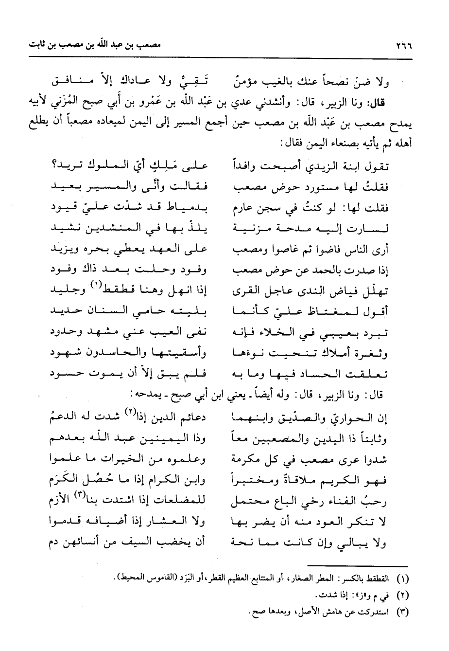 ولا ضن نصحا عنك بالغيب مؤمن * تقي ولا عاداك إلا منافق * قال ونا الزبير قال وأنشدني عدي بن عبد الله بن عمرو بن أبي صبح المزني لأبيه يمدح مصعب بن عبد الله بن مصعب حين أجمع المسير إلى اليمن لميعاده مصعبا أن يطلع أهله ثم يأتيه بصنعاء اليمن فقال * تقول ابنة الزيدي أصبحت وافدا * على ملك أي الملوك تريد فقلت لها مستورد حوض مصعب * فقالت وأنى والمسير بعيد فقلت لها لو كنت في سجن عارم * بدمياط قد شدت علي قيود لسارت إليه مدحة مزنية * يلذ بها في المنشدين نشيد أرى الناس فاضوا ثم غاصوا ومصعب * على العهد يعطي بحره ويزيد إذا صدرت بالحمد عن حوض مصعب * وفود وحلت بعد ذاك وفود تهلل فياض الندى عاجل القرى * إذا انهل وهنا قطقط (1) وجليد أقول لمغتاظ علي كأنما * بليته حامي السنان حديد * * تبرد بعيبي في الخلاء فإنه * نفى العيب عني مشهد وحدود وثغرة أملاك تنحيت نوءها * وأسقيتها والحاسدون شهود تعلقت الحساد فيها وما به * فلم يبق إلا أن يموت حسود * قال ونا الزبير قال وله أيضا يعني ابن أبي صبح يمدحه * إن الحواري والصديق وابنهما * دعائم الدين إذا (2) شدت له الدعم وثابتا ذا اليدين والمصعبين معا * وذا اليمينين عبد الله بعدهم شدوا عرى مصعب في كل مكرمة * وعلموه من الخيرات ما علموا فهو الكريم ملاقاة ومختبرا * وابن الكرام إذا ما حصل الكرم رحب الفناء رخي الباع محتمل * للمضلعات إذا اشتدت بنا (3) الأزم لا تنكر العود منه أن يضر بها * ولا العشار إذا أضيافه قدموا ولايبالي وإن كانت مما نحة * أن يخضب السيف من أنسائهن دم