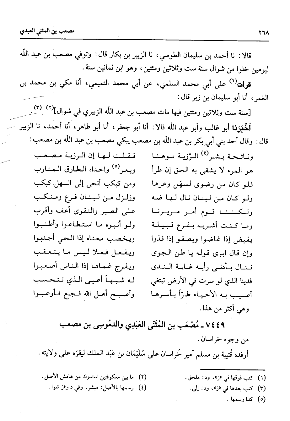 7449 - مصعب بن المثنى العبدي والد موسى بن مصعب من وجوه خراسان أوفده قتيبة بن مسلم أمير خراسان على سليمان بن عبد الملك ليقره على ولايته
