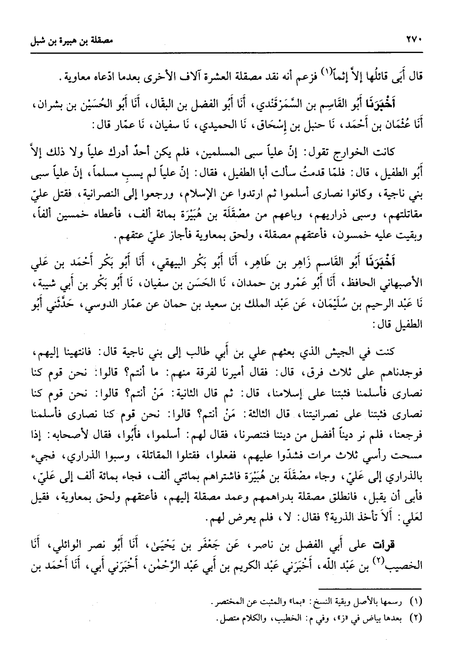قال أبى قائلها إلا إثما (1) فزعم أنه نقد مصقلة العشرة آلاف الأخرى بعدما ادعاه معاوية أخبرنا أبو القاسم بن السمرقندي أنا أبو الفضل بن البقال أنا أبو الحسين بن بشران أنا عثمان بن أحمد نا حنبل بن إسحاق نا الحميدي نا سفيان نا عمار قال كانت الخوارج تقول إن عليا سبى المسلمين فلم يكن أحد أدرك عليا ولا ذلك إلا أبو الطفيل قال فلما قدمت سألت أبا الطفيل فقال إن عليا لم يسب مسلما إن عليا سبى بني ناجية وكانوا نصارى أسلموا ثم ارتدوا عن الإسلام ورجعوا إلى النصرانية فقتل علي مقاتلتهم وسبى ذراريهم وباعهم من مصقلة بن هبيرة بمائة ألف فأعطاه خمسين ألفا وبقيت عليه خمسون فأعتقهم مصقلة ولحق بمعاوية فأجاز علي عتقهم أخبرنا أبو القاسم زاهر بن طاهر أنا أبو بكر البيهقي أنا أبو بكر أحمد بن علي الأصبهاني الحافظ أنا أبو عمرو بن حمدان نا الحسن بن سفيان نا أبو بكر بن أبي شيبة نا عبد الرحيم بن سليمان عن عبد الملك بن سعيد بن حمان عن عمار الدوسي حدثني أبو الطفيل قال كنت في الجيش الذي بعثهم علي بن أبي طالب إلى بني ناجية قال فانتهينا إليهم فوجدناهم على ثلاث فرق قال فقال أميرنا لفرقة منهم ما أنتم قالوا نحن قوم كنا نصارى فأسلمنا فثبتنا على إسلامنا قال ثم قال الثانية من أنتم قالوا نحن قوم كنا نصارى فثبتنا على نصرانيتنا قال الثالثة من أنتم قالوا نحن قوم كنا نصارى فأسلمنا فرجعنا فلم نر دينا أفضل من ديننا فتنصرنا فقال لهم أسلموا فأبوا فقال لأصحابه إذا مسحت رأسي ثلاث مرات فشدوا عليهم ففعلوا فقتلوا المقاتلة وسبوا الذراري فجئ بالذراري إلى علي وجاء مصقلة بن هبيرة فاشتراهم بمائتي ألف فجاءه بمائة ألف إلى علي فأبى أن يقبل فانطلق مصقلة بدراهمهم وعمد مصقلة إليهم فأعتقهم ولحق بمعاوية فقيل لعلي ألا تأخذ الذرية فقال لا فلم يعرض لهم قرأت على أبي الفضل بن ناصر عن جعفر بن يحيى أنا أبو نصر الوائلي أنا الخصيب (2) بن عبد الله أخبرني عبد الكريم بن أبي عبد الرحمن أخبرني أبي أنا أحمد بن