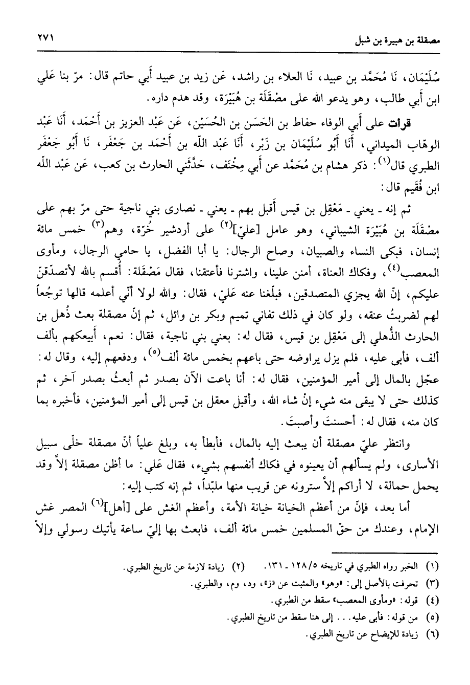 سليمان نا محمد بن عبيد نا العلاء بن راشد عن زيد بن عبيد أبي حاتم قال مر بنا علي ابن أبي طالب وهو يدعو الله على مصقلة بن هبيرة وقد هدم داره قرأت على أبي الوفاء حفاط بن الحسن بن الحسين عن عبد العزيز بن أحمد أنا عبد الوهاب الميداني أنا أبو سليمان بن زبر أنا عبد الله بن أحمد بن جعفر نا أبو جعفر الطبري قال (1) ذكر هشام بن محمد عن أبي مخنف حدثني الحارث بن كعب عن عبد الله ابن فقيم قال ثم إنه يعني معقل بن قيس أقبل بهم يعني نصارى بني ناجية حتى مر بهم على مصقلة بن هبيرة الشيباني وهو عامل علي (2) على أردشير خرة وهم (3) خمس مائة إنسان فبكى النساء والصبيان وصاح الرجال يا أبا الفضل يا حامي الرجال ومأوى المعصب (4) وفكاك العناة أمنن علينا واشترنا فأعتقنا فقال مصقلة أقسم بالله لأتصدقن عليكم إن الله يجزي المتصدقين فبلغنا عنه علي فقال والله لولا أني أعلمه قالها توجعا لهم لضربت عنقه ولو كان في ذلك تفاني تميم وبكر بن وائل ثم إن مصقلة بعث ذهل بن الحارث الذهلي إلى معقل بن قيس فقال له بعني بني ناجية فقال نعم أبيعكهم بألف ألف فأبى عليه فلم يزل يراوضه حتى باعهم بخمس مائة ألف (5) ودفعهم إليه وقال له عجل بالمال إلى أمير المؤمنين فقال له أنا باعت الآن بصدر ثم أبعث لك بصدر آخر ثم كذلك حتى لا يبقى منه شئ إن شاء الله وأقبل معقل بن قيس إلى أمير المؤمنين فأخبره بما كان منه فقال له أحسنت وأصبت وانتظر علي مصقلة أن يبعث إليه بالمال فأبطأ به وبلغ عليا أن مصقلة خلى سبيل الأسارى ولم يسألهم أن يعينوه في فكاك أنفسهم بشئ فقال علي ما أظن مصقلة إلا وقد يحمل حمالة لا أراكم إلا سترونه عن قريب منها ملبدا ثم إنه كتب إليه أما بعد فإن من أعظم الخيانة خيانة الأمة وأعظم الغش على أهل (6) المصر غش الإمام وعندك من حق المسلمين خمس مائة ألف فابعث بها إلي ساعة يأتيك رسولي وإلا