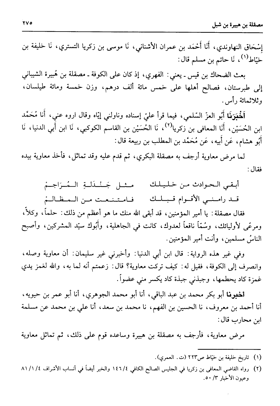 إسحاق النهاوندي أنا أحمد بن عمران الأشناني نا موسى بن زكريا التستري نا خليفة بن خياط (1) نا حاتم بن مسلم قال بعث الضحاك بن قيس يعني الفهري إذ كان على الكوفة مصقلة بن هبيرة الشيباني إلى طبرستان فصالح أهلها على خمس مائة ألف درهم وزن خمسة ومائة طيلسان وثلاثمائة رأس أخبرنا أبو العز السلمي فيما قرأ علي إسناده وناولني إياه وقال اروه عني أنا محمد ابن الحسين أنا المعافى بن زكريا (2) نا الحسين بن القاسم الكوكبي نا ابن أبي الدنيا نا أبو هشام عن أبيه عن محمد بن المطلب بن ربيعة قال لما مرض معاوية أرجف به مصقلة البكري ثم قدم عليه وقد تماثل فأخذ معاوية بيده فقال * أبقي الحوادث من خليلك * مثل جندلة المراجم قد رامني الأقوام قبلك * فامتنعت من المظالم * فقال مصقلة يا أمير المؤمنين قد أبقى الله منك ما هو أعظم من ذلك حلما وكلأ ومرعى لأوليائك وسما ناقعا لعدوك كانت في الجاهلية وأبوك سيد المشركين وأصبح الناس مسلمين وأنت أمير المؤمنين وفي غير هذه الرواية قال ابن أبي الدنيا وأخبرني غير سليمان أن معاوية وصله وانصرف إلى الكوفة فقيل له كيف تركت معاوية قال زعمتم أنه لما به والله لغمز يدي غمزة كاد يحطمها وجبذني جبذة كاد يكسر مني عضوا أخبرنا أبو بكر محمد بن عبد الباقي أنا أبو محمد الجوهري أنا أبو عمر بن حيوية أنا أحمد بن معروف نا الحسين بن الفهم نا محمد بن سعد أنا علي بن محمد عن مسلمة ابن محارب قال مرض معاوية فأرجف به مصقلة بن هبيرة وساعده قوم على ذلك ثم تماثل معاوية