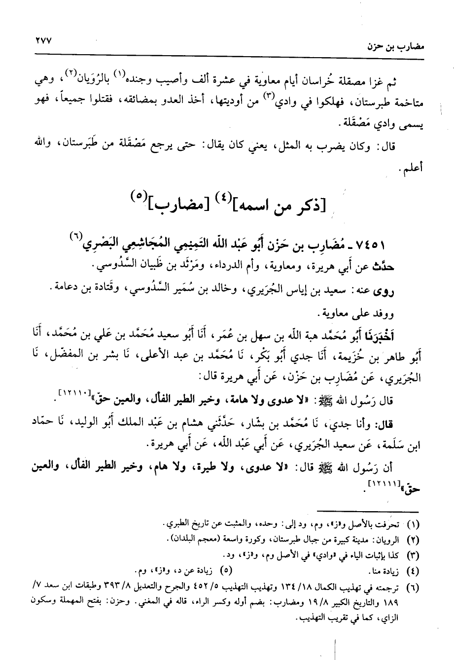 7451 - مضارب بن حزن أبو عبد الله التميمي المجاشعي البصري (6) حدث عن أبي هريرة ومعاوية وأم الدرداء ومرثد بن ظبيان السدوسي روى عنه سعيد بن إياس الجريري وخالد بن سمير السدوسي وقتادة بن دعامة ووفد على معاوية أخبرنا أبو محمد هبة الله بن سهل بن عمر أنا أبو سعيد بن محمد بن علي بن محمد أنا أبو طاهر بن خزيمة أنا جدي أبو بكر نا محمد بن عبد الأعلى نا بشر بن المفضل نا الجريري عن مضارب بن حزن عن أبي هريرة قال قال رسول الله (صلى الله عليه وسلم) لا عدوى ولا هامة وخير الطير الفأل والعين حق قال وأنا جدي نا محمد بن بشار حدثني هشام بن عبد الملك أبو الوليد نا حماد ابن سلمة عن سعيد الجريريعن أبي عبد الله عن أبي هريرة أن رسول الله (صلى الله عليه وسلم) قال لا عدوى ولا طيرة ولا هام وخير الطير الفأل والعين حق