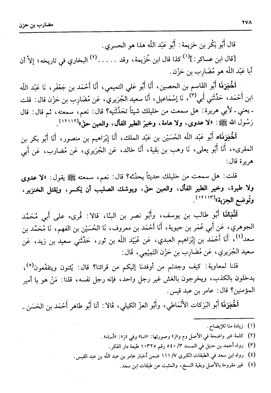 قال أبو بكر بن خزيمة أبو عبد الله هذا هو الحسري قال ابن عساكر (1) كذا قال ابن خزيمة وقد (2) البخاري في تاريخه إلا أن أبا عبد الله هو مضارب بن حزن أخبرنا أبو القاسم بن الحصين أنا أبو علي التميمي أنا أحمد بن جعفر نا عبد الله ابن أحمد حدثني أبي (3) نا إسماعيل أنا سعيد الجريري عن مضارب بن حزن قال قلت يعني لأبي هريرة هل سمعت من خليلك شيئا تحدثنيه قال نعم سمعته ثم قال قال رسول الله (صلى الله عليه وسلم) لا عدوى ولا هامة وخير الطير الفأل والعين حق أخبرناه أبو عبد الله الحسين بن عبد الملك أنا إبراهيم بن منصور أنا أبو بكر بن المقرئ أنا أبو يعلى نا وهب بن بقية أنا خالد عن الجريري عن مضارب عن أبي هريرة قال قلت هل سمعت من خليلك حديثا يحدثه قال نعم سمعته (صلى الله عليه وسلم) يقول لا عدوى ولا طيرة وخير الطير الفأل والعين حق ويوشك الصليب أن يكسر ويقتل الخنزير وتوضع الجزية أنبأنا أبو طالب بن يوسف وأبو نصر بن البنا قالا قرئ على أبي محمد الجوهري عن أبي عمر بن حيوية أنا أحمد بن معروف نا الحسين بن الفهم نا محمد بن سعد (4) أنا أحمد بن إبراهيم العبدي عن عبيد الله بن ثور حدثني سعيد بن زيد عن سعيد الجريري عن مضارب بن حزن التميمي قال قلنا لمعاوية كيف وجدتم من أوفدنا إليكم من قرائنا قال يثنون ويتقفعون (5) يدخلون بالكذب ويخرجون بالغش غير رجل واحد فإنه رجل نفسه قلنا من هو يا أمير المؤمنين قال عامر بن عبد قيس أخبرنا أبو البركات الأنماطي وأبو العز الكيلي قالا أنا أبو طاهر أحمد بن الحسن