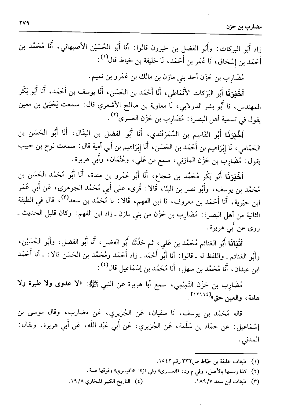 زاد أبو البركات وأبو الفضل بن خيرون قالوا أنا أبو الحسين الأصبهاني أنا محمد بن أحمد بن إسحاق نا عمر بن أحمد نا خليفة بن خياط قال (1) مضارب بن حزن أحد بني مازن بن مالك بن عمرو بن تميم أخبرنا أبو البركات الأنماطي أنا أحمد بن الحسن أنا يوسف بن أحمد أنا أبو بكر المهندس نا أبو بشر الدولابي نا معاوية بن صالح الأشعري قال سمعت يحيى بن معين يقول في تسمية أهل البصرة مضارب بن حزن العسرى (2) أخبرنا أبو القاسم بن السمرقندي أنا أبو الفضل بن البقال أنا أبو الحسن بن الحمامي نا إبراهيم بن أحمد بن الحسن أنا إبراهيم بن أبي أمية قال سمعت نوح بن حبيب يقول مضارب بن حزن المازني سمع من علي وعثمان وأبي هريرة أخبرنا أبو بكر محمد بن شجاع أنا أبو عمرو بن مندة أنا أبو محمد الحسن بن محمد بن يوسف وأبو نصر بن البنا قالا قرئ على أبي محمد الجوهري عن أبي عمر ابن حيوية أنا أحمد بن معروف نا ابن الفهم قالا نا محمد بن سعد (3) قال في الطبقة الثانية من أهل البصرة مضارب بن حزن من بني مازن زاد أبو الفهم وكان قليل الحديث روى عن أبي هريرة أنبأنا أبو الغنائم محمد بن علي ثم حدثنا أبو الفضل أنا أبو الفضل وأبو الحسين وأبو الغنائم واللفظ له قالوا أنا أبو أحمد زاد أحمد ومحمد بن الحسن قالا أنا أحمد ابن عبدان أنا محمد بن سهل أنا محمد بن إسماعيل قال (4) مضارب بن حزن التميمي سمع أبا هريرة عن النبي (صلى الله عليه وسلم) لا عدوى ولا طيرة ولا هامة والعين حق قاله محمد بن يوسف نا سفيان عن الجريري عن مضارب وقال موسى بن إسماعيل عن حماد بن سلمة عن الجريري عن أبي عبد الله عن أبي هريرة ويقال المدني