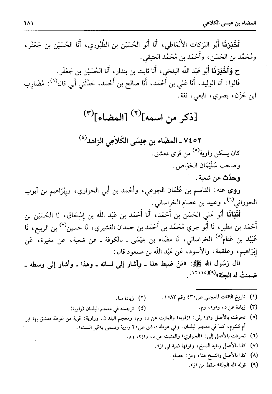 7452 - المضاء بن عيسى الكلاعي الزاهد (4) كان يسكن راوية (5) من قرى دمشق وصحب سليمان الخواص وحدث عن شعبة روى عنه القاسم بن عثمان الجوعي وأحمد بن أبي الحواري وإبراهيم بن أيوب الحوراني (6) وعبيد بن عصام الخراساني أنبأنا أبو علي الحسن بن أحمد أنا أحمد بن عبد الله بن إسحاق نا الحسين بن أحمد بن مطير نا أبو جري محمد بن أحمد بن حمدان القشيري نا حسين (7) بن الربيع نا عبيد بن غنام (8) الخراساني نا مضاء بن عيسى بالكوفة عن شعبة عن مغيرة عن إبراهيم وعلقمة والأسود عن عبد الله بن مسعود قال قال رسول الله (صلى الله عليه وسلم) من ضبط هذا وأشار إلى لسانه وهذا وأشار إلى وسطه ضمنت له الجنة (9)