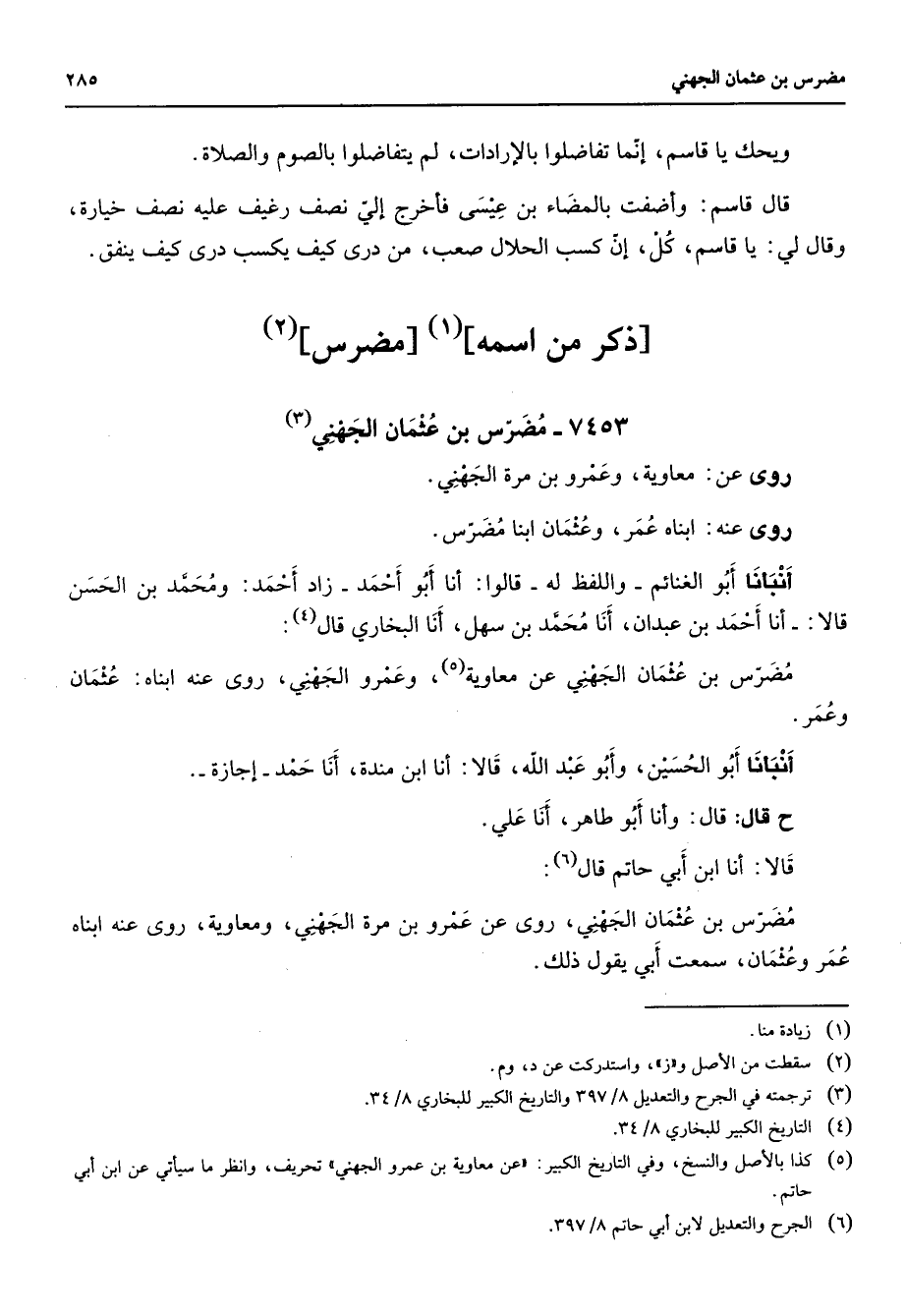 7453 - مضرس بن عثمان الجهني (3) روى عن معاوية وعمرو بن مرة الجهني روى عنه ابناه عمر وعثمان ابنا مضرس أنبأنا أبو الغنائم واللفظ له قالوا أنا أبو أحمد زاد أحمد ومحمد بن الحسن قالا أنا أحمد بن عبدان أنا محمد بن سهل أنا البخاري قال (4) مضرس بن عثمان الجهني عن معاوية (5) وعمرو الجهني روى عنه ابناه عثمان وعمر أنبأنا أبو الحسين وأبو عبد الله قالا أنا ابن مندة أنا حمد إجازة ح قال قال وأنا أبو طاهر أنا علي قالا أنا ابن أبي حاتم قال (6) مضرس بن عثمان الجهني روى عن عمرو بن مرة الجهني ومعاوية روى عنه ابناه عمر وعثمان سمعت أبي يقول ذلك