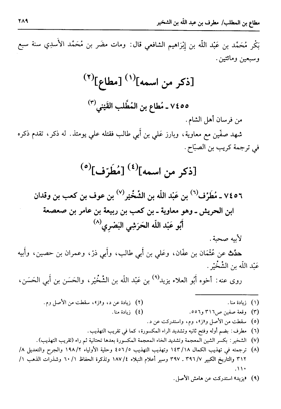7456 - مطرف (6) بن عبد الله بن الشخير (7) بن عوف بن كعب بن وقدان ابن الحريش وهو معاوية بن كعب بن ربيعة بن عامر بن صعصعة أبو عبد الله الحرشي البصري (8) لأبيه صحبة حدث عن عثمان بن عفان وعلي بن أبي طالب وأبي ذر وعمران بن حصين وأبيه عبد الله بن الشخير روى عنه أخوه أبو العلاء يزيد (9) بن عبد الله بن الشخير والحسن بن أبي الحسن