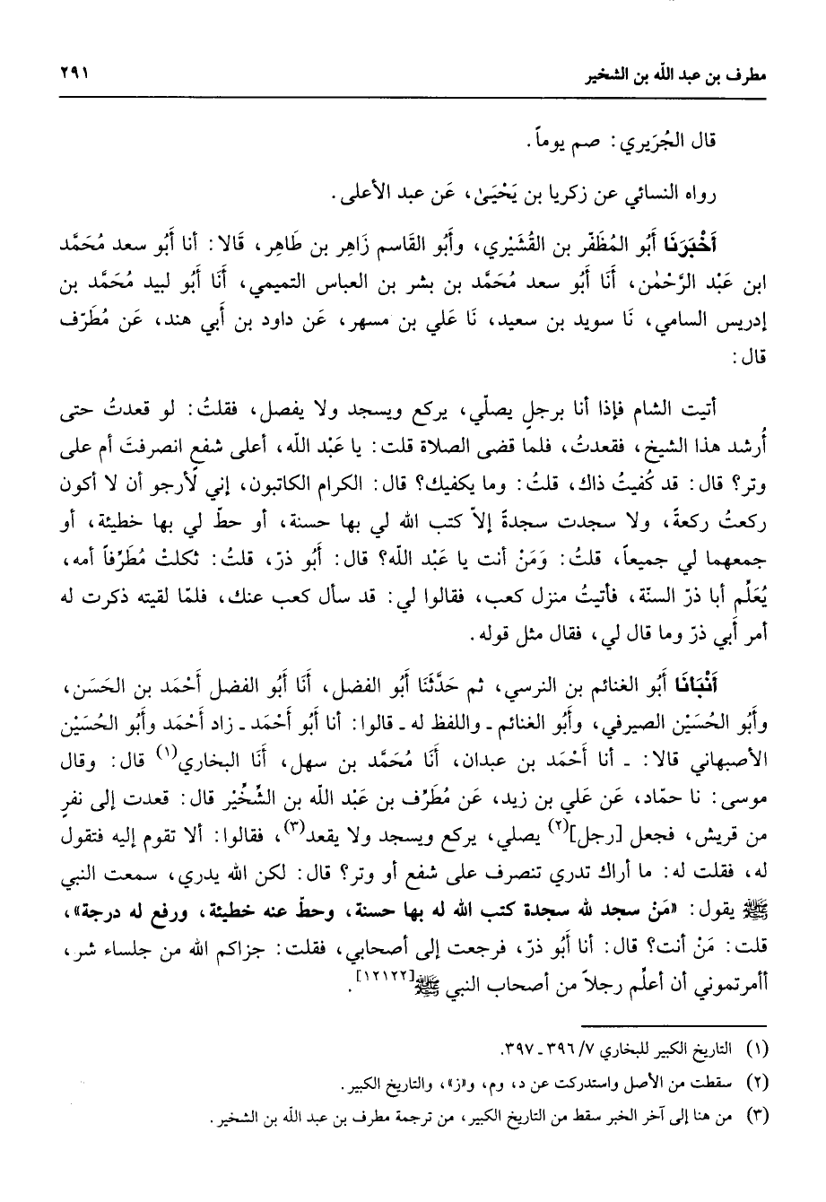 قال الجريري صم يوما رواه النسائي عن زكريا بن يحيى عن عبد الأعلى أخبرنا أبو المظفر بن القشيري وأبو القاسم زاهر بن طاهر قالا أنا أبو سعد محمد ابن عبد الرحمن أنا أبو سعد محمد بن بشر بن العباس التميمي أنا أبو لبيد محمد بن إدريس السامي نا سويد بن سعيد نا علي بن مسهر عن داود بن أبي هند عن مطرف قال أتيت الشام فإذا برجل يصلي يركع ويسجد ولا يفصل فقلت لو قعدت حتى أرشد هذا الشيخ فقعدت فلما قضى الصلاة قلت يا عبد الله أعلى شفع انصرفت أم على وتر قال قد كفيت ذاك قلت وما يكفيك قال الكرام الكاتبون إني لأرجو أن لا أكون ركعت ركعة ولا سجدت سجدة إلا كتب الله لي بها حسنة أو حط لي بها خطيئة أو جمعهما لي جميعا قلت ومن أنت يا عبد الله قال أبو ذر قلت ثكلت مطرفا أمه يعلم أبا ذر السنة فأتيت منزل كعب فقالوا لي قد سأل كعب عنك فلما لقيته ذكرت له أمر أبي ذر وما قال لي فقال مثل قوله أنبأنا أبو الغنائم بن النرسي ثم حدثنا أبو الفضل أنا أبو الفضل أحمد بن الحسن وأبو الحسين الصيرفي وأبو الغنائم واللفظ له قالوا أنا أبو أحمد زاد أحمد وأبو الحسين الأصبهاني قالا أنا أحمد بن عبدان أنا محمد بن سهل أنا البخاري (1) قال وقال موسى نا حماد عن علي بن زيد عن مطرف بن عبد الله بن الشخير قال قعدت إلى نفر من قريش فجعل رجل (2) يصلي يركع ويسجد ولا يقعد (3) فقالوا ألا تقوم إليه فتقول له فقلت له ما أراك تدري تنصرف على شفع أو وتر قال لكن الله يدري سمعت النبي (صلى الله عليه وسلم) يقول من سجد لله سجدة كتب الله له بها حسنة وحط عنه خطيئة ورفع له درجة قلت من أنت قال أنا أبو ذر فرجعت إلى أصحابي فقلت جزاكم الله من جلساء شر أمرتموني أن أعلم رجلا من أصحاب النبي (صلى الله عليه وسلم) ح