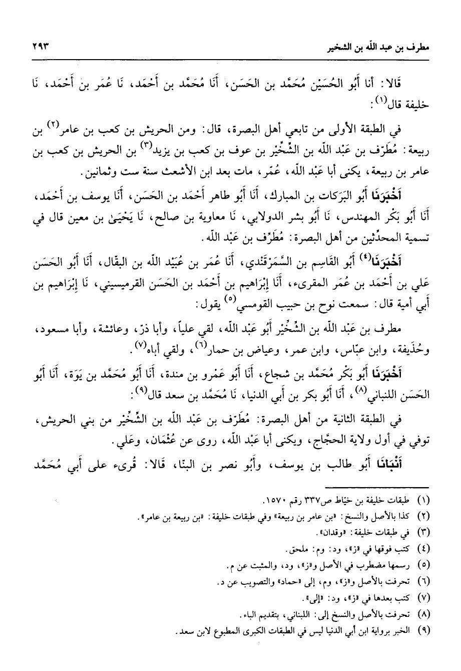 قالا أنا أبو الحسين محمد بن الحسن أنا محمد بن أحمد نا عمر بن أحمد نا خليفة قال (1) في الطبقة الأولى من تابعي أهل البصرة قال ومن الحريش بن كعب بن عامر (2) بن ربيعة مطرف بن عبد الله بن الشخير بن عوف بن كعب بن يزيد (3) بن الحريش بن كعب بن عامر بن ربيعة يكنى أبا عبد الله عمر مات بعد ابن الأشعث سنة ست وثمانين أخبرنا أبو البركات بن المبارك أنا أبو طاهر أحمد بن الحسن أنا يوسف بن أحمد أنا أبو بكر المهندس نا أبو بشر الدولابي نا معاوية بن صالح نا يحيى بن معين قال في تسمية المحدثين من أهل البصرة مطرف بن عبد الله أخبرنا (4) أبو القاسم بن السمرقندي أنا عمر بن عبيد الله بن البقال أنا أبو الحسن علي بن أحمد بن عمر بن المقرئ أنا إبراهيم بن أحمد القرميسيني نا إبراهيم بن أبي أمية قال سمعت نوح بن حبيب القومسي (5) يقول مطرف بن عبد الله بن الشخير أبو عبد الله لقي عليا وأبا ذر وعائشة وأبا مسعود وحذيفة وأبا مسعود وحذيفة وابن عباس وابن عمر وعياض بن حمار (6) ولقي أباه (7) أخبرنا أبو بكر محمد بن شجاع أنا أبو عمرو بن مندة أنا أبو محمد بن يوة أنا أبو الحسن اللنباني (8) أنا أبو بكر بن أبي الدنيا نا محمد بن سعد قال (9) في الطبقة الثانية من أهل البصرة مطرف بن عبد الله بن الشخير من بني الحريش توفي في أول ولاية الحجاج ويكنى أبا عبد الله روى عن عثمان وعلي أنبأنا أبو طالب بن يوسف وأبو نصر بن البنا قالا قرئ على أبي محمد