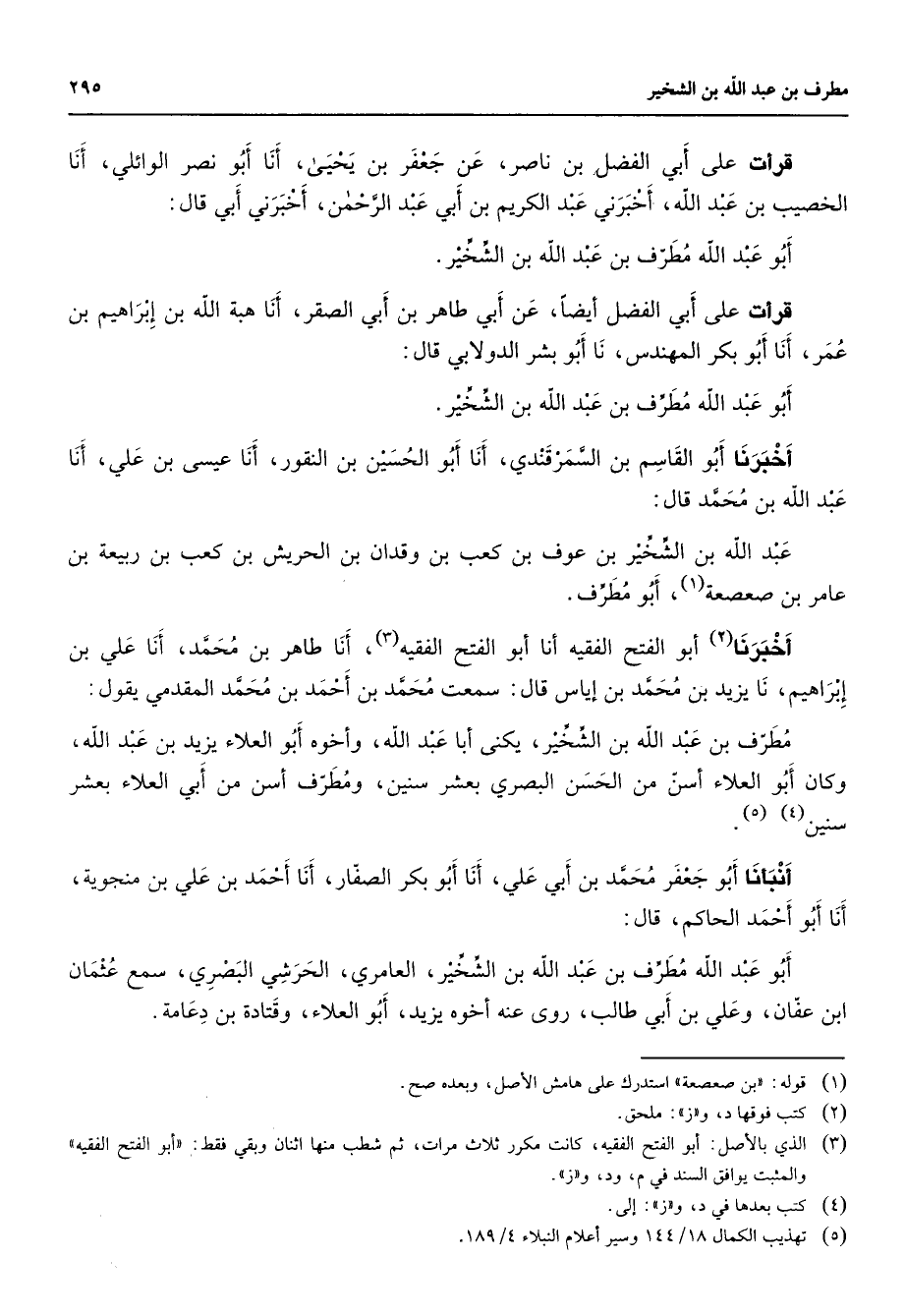 قرأت على أبي الفضل بن ناصر عن جعفر بن يحيى أنا أبو نصر الوائلي أنا الخصيب بن عبد الله أخبرني عبد الكريم بن أبي عبد الرحمن أخبرني أبي قال أبو عبد الله مطرف بن عبد الله بن الشخير قرأت على أبي الفضل أيضا عن أبي طاهر بن أبي الصقر أنا هبة الله بن إبراهيم بن عمر أنا أبو بكر المهندس أنا أبو بشر الدولابي قال أبو عبد الله مطرف بن عبد الله بن الشخير أخبرنا أبو القاسم بن السمرقندي أنا أبو الحسين بن النقور أنا عيسى بن علي أنا عبد الله بن محمد قال عبد الله بن الشخير بن عوف بن كعب بن وقدان بن الحريش بن كعب بن ربيعة بن عامر بن صعصعة (1) أبو مطرف أخبرنا (2) أبو الفتح الفقيه أنا أبو الفتح الفقيه (3) أنا طاهر بن محمد أنا علي بن إبراهيم نا يزيد بن محمد بن إياس قال سمعت محمد بن أحمد بن محمد المقدمي يقول مطرف بن عبد الله بن الشخير يكنى أبا عبد الله وأخوه أبو العلاء يزيد بن عبد الله وكان أبو العلاء أسن من الحسن البصري بعشر سنين ومطرف أسن من أبي العلاء بعشر سنين (4) (5) أنبأنا أبو جعفر محمد بن أبي علي أنا أبو بكر الصفار أنا أحمد بن علي بن منجوية أنا أبو أحمد الحاكم قال أبو عبد الله مطرف بن عبد الله بن الشخير العامري الحرشي البصري سمع عثمان ابن عفان وعلي بن أبي طالب روى عنه أخوه يزيد أبو العلاء وقتادة بن دعامة