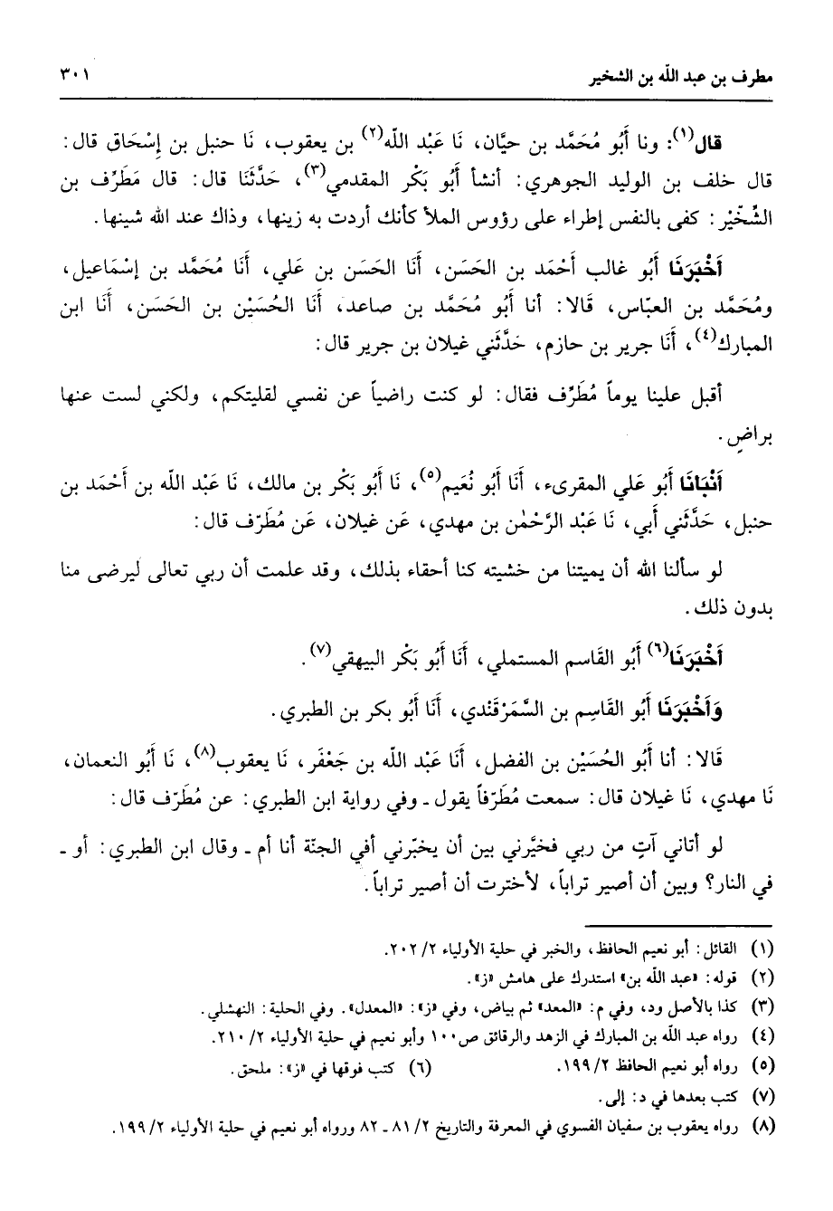 (*) صفحة 302 / قال ونا يعقوب (1) نا الحجاج بن منهال وقال ابن الطبري المنهال نا مهدي زاد البيهقي ابن ميمون قال (2) قال مطرف لقد كاد خوف النار يحول بيني وبين أن أسأل الله الجنة أخبرنا أبو محمد الحسن بن أبي بكر أنا أبو عاصم الفضيل (3) بن يحيى أنا أبو محمد بن أبي شريح نا محمد بن عقيل بن الأزهر نا أبو عبيد الله يعني حماد بن الحسن الوراق نا سيار بن حاتم نا جعفر بن سليمان نا المعلى بن زياد القردوسي (4) قال كان إخوان مطرف بن عبد الله عنده فأفاضوا في ذكر الجنة فقال مطرف لا أدري ما يقولون حال ذكر النار بيني وبين الجنة أنبأنا أبو علي المقرئ نا أبو نعيم الحافظ (5) نا عبد الله بن محمد (6) نا محمد بن أبي سهل نا عبد الله بن محمد العبسي نا عفان نا حماد عن ثابت أن مطرفا كان يقول لو أن رجلا رأى صيدا والصيد لا يراه يختله أليس يوشك أن يأخذه قالوا بلى قال فإن الشيطان هو يرانا ونحن لا نراه وهو يصيب منا أخبرنا (7) أبو القاسم الشحامي أنا أبو الحسن عبيد الله بن محمد بن إسحاق بن مندة أنا أبي أبو عبد الله ح وأخبرتنا أم النجم بنت أحمد بن عبد الله السوذرجانية بأصبهان قالت أنا أبو طاهر محمد بن أحمد بن عمر النقاش نا محمد بن إسحاق بن مندة الحافظ أنا عبد الله بن محمد بن الحارث البخاري نا داود بن أبي العوام نا يحيى بن حاتم نا الحسن بن دينار عن أيوب السختياني عن حميد بن هلال قال قال مطرف بن عبد الله