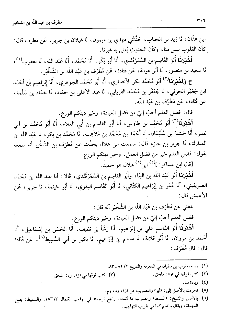 ابن عفان نا زيد بن الحباب حدثني مهدي بن ميمون نا غيلان بن جرير عن مطرف قال كأن القلوب ليس منا وكأن الحديث يعنى به غيرنا أخبرنا أبو القاسم بن السمرقندي أنا أبو بكر أنا محمد أنا عبد الله نا يعقوب (1) نا سعيد بن منصور نا أبو عوانة عن قتادة عن مطرف بن عبد الله بن الشخير ح وأخبرنا (2) أبو محمد بكر الأنصاري أنا أبو محمد الجوهري أنا إبراهيم بن أحمد ابن جعفر الحرفي نا جعفر بن محمد الفريابي نا عبد الأعلى بن حماد نا حماد بن سلمة عن قتادة عن مطرف بن عبد الله قال فضل العلم أحب إلي من فضل العبادة وخير دينكم الورع أخبرنا (3) أبو محمد بن طاوس أنا أبو القاسم بن أبي العلاء أنا أبو محمد بن أبي نصر أنا خيثمة بن سليمان نا أحمد بن محمد بن ملاعب نا محمد بن بكر نا عبد الله بن المبارك نا جرير بن حازم قال سمعت ابن هلال يحدث عن مطرف بن الشخير أنه سمعه يقول فضل العلم خير من فضل العمل وخير دينكم الورع قال ابن عساكر (4) ابن (5) هلال هو حميد أخبرنا أبو عبد الله بن البنا وأبو القاسم بن السمرقندي قالا أنا عبد الله بن محمد الصريفيني أنا عمر بن إبراهيم الكتاني نا أبو القاسم البغوي نا أبو خيثمة نا جرير عن الأعمش قال بلغني عن مطرف بن عبد الله بن الشخير أنه قال فضل العلم أحب إلي من فضل العبادة وخير دينكم الورع أخبرنا أبو القاسم علي بن إبراهيم أنا رشأ بن نظيف أنا الحسن بن إسماعيل أنا أحمد بن مروان نا أبو قلابة نا مسلم بن إبراهيم نا بكير بن أبي السميط (6) عن قتادة قال قال مطرف