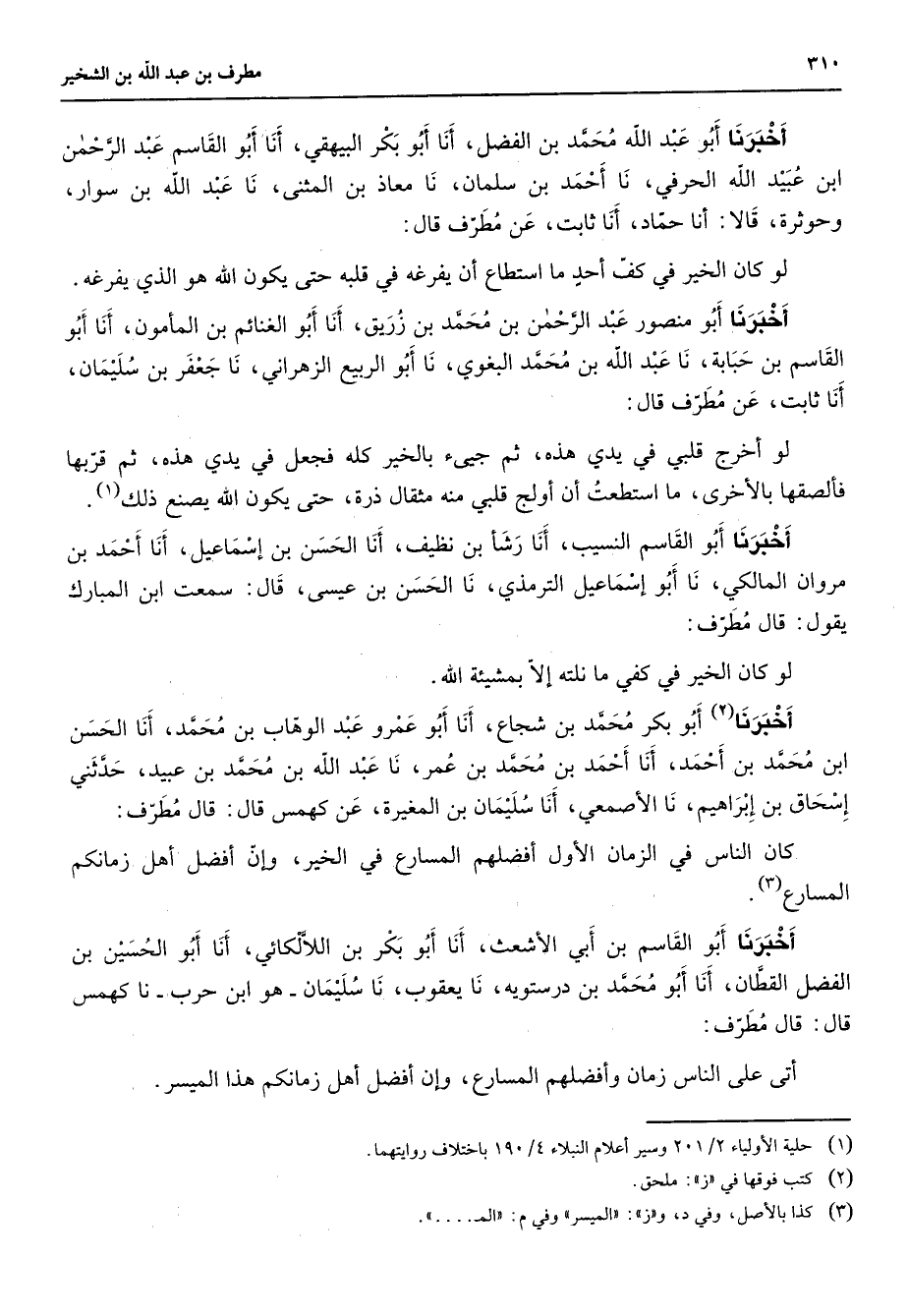 أخبرنا أبو عبد الله محمد بن الفضل أنا أبو بكر البيهقي أنا أبو القاسم عبد الرحمن ابن عبيد الله الحرفي نا أحمد بن سلمان نا معاذ بن المثنى نا عبد الله بن سوار وحوثرة قالا أنا حماد أنا ثابت عن مطرف قال لو كان الخير في كف أحد ما استطاع أن يفرغه في قلبه حتى يكون الله هو الذي يفرغه أخبرنا أبو منصور عبد الرحمن بن محمد بن زريق أنا أبو الغنائم بن المأمون أنا أبو القاسم بن حبابة نا عبد الله بن محمد البغوي نا أبو الربيع الزهراني نا جعفر بن سليمان أنا ثابت عن مطرف قال لو أخرج قلبي في يدي هذه ثم جيئ بالخير كله فجعل في يدي هذه ثم قربها فألصقها بالأخرى ما استطعت أن أولج قلبي منه مثقال ذرة حتى يكون الله يصنع ذلك (1) أخبرنا أبو القاسم النسيب أنا رشأ بن نظيف أنا الحسن بن إسماعيل أنا أحمد بن مروان المالكي أنا أبو إسماعيل الترمذي نا الحسن بن عيسى قال سمعت ابن المبارك يقول قال مطرف لو كان الخير في كفي ما نلته إلا بمشيئة الله أخبرنا (2) أبو بكر محمد بن شجاع أنا أبو عمرو عبد الوهاب بن محمد أنا الحسن ابن محمد بن أحمد أنا أحمد بن محمد بن عمر نا عبد الله بن محمد بن عبيد حدثني إسحاق بن إبراهيم نا الأصمعي أنا سليمان بن المغيرة عن كهمس قال قال مطرف كان الناس في الزمان الأول أفضلهم المسارع في الخير وإن أفضل أهل زمانكم المسارع (3) أخبرنا أبو القاسم بن أبي الأشعث أنا أبو بكر اللالكائي أنا أبو الحسين بن الفضل القطان أنا أبو محمد بن درستوية نا يعقوب نا سليمان هو ابن حرب نا كهمس قال قال مطرف أتى على الناس زمان وأفضلهم المسارع وإن أفضل أهل زمانكم هذا الميسر