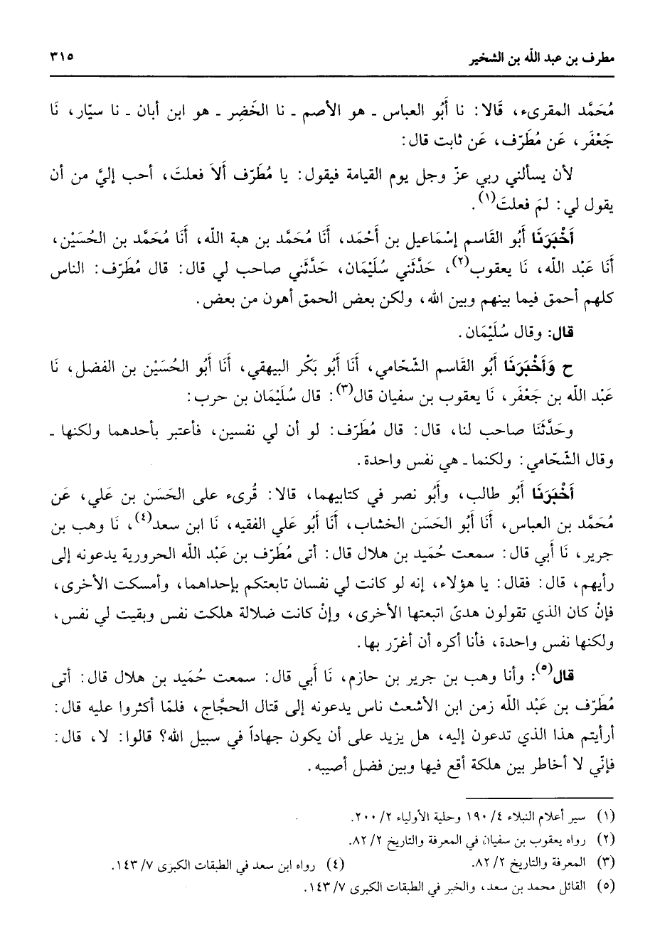 محمد المقرئ قالا نا أبو العباس هو الأصم نا الخضر هو ابن أبان نا سيار نا جعفر عن مطرف عن ثابت قال لأن يسألني ربي عز وجل يوم القيامة فيقول يا مطرف ألا فعلت أحب إلي من أن يقول لي لم فعلت (1) أخبرنا أبو القاسم إسماعيل بن أحمد أنا محمد بن هبة الله أنا محمد بن الحسين أنا عبد الله نا يعقوب (2) حدثني سليمان حدثني صاحب لي قال قال مطرف الناس كلهم أحمق فيما بينهم وبين الله ولكن بعض الحمق أهون من بعض قال وقال سليمان ح وأخبرنا أبو القاسم الشحامي أنا أبو بكر البيهقي أنا أبو الحسين بن الفضل نا عبد الله بن جعفر نا يعقوب بن سفيان قال (3) قال سليمان بن حرب وحدثنا صاحب لنا قال قال مطرف لو أن لي نفسين فأعتبر بأحدهما ولكنها وقال الشحامي ولكنما هي نفس واحدة أخبرنا أبو طالب وأبو نصر في كتابيهما قالا قرئ على الحسن بن علي عن محمد بن العباس أنا أبو الحسن الخشاب أنا أبو علي الفقيه نا ابن سعد (4) نا وهب بن جرير نا أبي قال سمعت حميد بن هلال قال أتى مطرف بن عبد الله الحرورية يدعونه إلى رأيهم قال فقال يا هؤلاء إنه لو كانت لي نفسان تابعتكم بإحداهما وأمسكت الأخرى فإن كان الذي تقولون هدى اتبعتها الأخرى وإن كانت ضلالة هلكت نفس وبقيت لي نفس ولكنها نفس واحدة فأنا أكره أن أغرر بها قال (5) وأنا وهب بن جرير بن حازم نا أبي قال سمعت حميد بن هلال قال أتى مطرف بن عبد الله زمن ابن الأشعث ناس يدعونه إلى قتال الحجاج فلما أكثروا عليه قال أرأيتم هذا الذي تدعون إليه هل يزيد على أن يكون جهادا في سبيل الله قالوا لا قال فإني لا أخاطر بين هلكة أقع فيها وبين فضل أصيبه