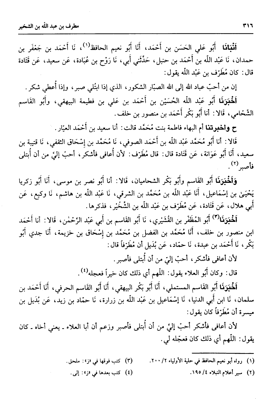 أنبأنا أبو علي الحسن بن أحمد أنا أبو نعيم الحافظ (1) نا أحمد بن جعفر بن حمدان نا عبد الله بن أحمد بن حنبل حدثني أبي نا روح بن عبادة عن سعيد عن قتادة قال كان مطرف بن عبد الله يقول إن من أحب عباد الله إلى الله الصبار الشكور الذي إذا ابتلي صبر وإذا أعطي شكر أخبرنا أبو عبد الله الحسين بن أحمد بن علي بن فطيمة البيهقي وأبو القاسم الشحامي قالا أنا أبو بكر أحمد بن منصور بن خلف ح وأخبرتنا أم البهاء فاطمة بنت محمد قالت أنا سعيد بن أحمد العيار قالا أنا أبو محمد عبد الله بن أحمد الصوفي نا محمد بن إسحاق الثقفي نا قتيبة بن سعيد أنا أبو عوانة عن قتادة قال قال مطرف لأن أعافي فأشكر أحب إلي من أن أبتلى فأصبر (2) وأخبرنا أبو القاسم وأبو بكر الشحاميان قالا أنا أبو نصر بن موسى أنا أبو زكريا يحيى بن إسماعيل أنا عبد الله بن محمد بن الشرقي نا عبد الله بن هاشم نا وكيع عن أبي هلال عن قتادة عن مطرف بن عبد الله بن الشخير فذكرها أخبرنا (3) أبو المظفر بن القشيري أنا أبو القاسم بن أبي عبد الرحمن قالا أنا أحمد ابن منصور بن خلف أنا محمد بن الفضل بن محمد بن إسحاق بن خزيمة أنا جدي أبو بكر نا أحمد بن عبدة نا حماد عن بديل أن مطرفا قال لأن أعافي فأشكر أحب إلي من أن أبتلى فأصبر قال وكان أبو العلاء يقول اللهم أي ذلك كان خيرا فعجله (4) أخبرنا أبو القاسم المستملي أنا أبو بكر البيهقي أنا أبو القاسم الحرفي أنا أحمد بن سلمان نا ابن أبي الدنيا نا إسماعيل بن عبد الله بن زرارة نا حماد بن زيد عن بديل بن ميسرة أن مطرفا كان يقول لأن أعافي فأشكر أحب إلي من أن أبتلى فأصبر وزعم أن أبا العلاء يعني أخاه كان يقول اللهم أي ذلك كان فعجله لي