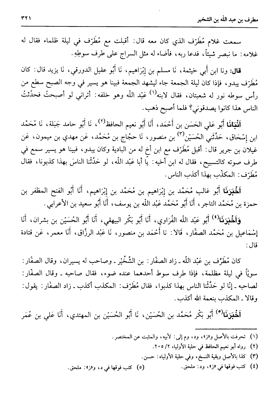 سمعت غلام مطرف الذي كان معه قال أقبلت مع مطرف في ليلة ظلماء فقال له غلامه ما نبصر شيئا فدعا ربه فأضاء له مثل السراج على طرف سوطه قال ونا ابن أبي خيثمة نا مسلم بن إبراهيم نا أبو عقيل الدورقي نا يزيد قال كان مطرف يبدو فإذا كان ليلة الجمعة جاء ليشهد الجمعة فبينا هو يسير في وجه الصبح سطع من رأس سوطه نور له شعبتان فقال لابنه (1) عبد الله وهو خلفه أتراني لو أصبحت فحدثت الناس هذا كانوا يصدقوني فلما أصبح ذهب أنبأنا أبو علي الحسن بن أحمد أنا أبو نعيم الحافظ (2) نا أبو حامد جبلة نا محمد ابن إسحاق حدثني الحسين (3) بن منصور نا حجاج بن محمد عن مهدي بن ميمون عن غيلان بن جرير قال أقبل مطرف مع ابن أخ له من البادية وكان يبدو فبينا هو يسير سمع في طرف صوته كالتسبيح فقال له ابن أخيه يا أبا عبد الله لو حدثنا الناس بهذا كذبونا فقال مطرف المكذب بهذا أكذب الناس أخبرنا أبو غالب محمد بن إبراهيم بن محمد بن إبراهيم أنا أبو الفتح المظفر بن حمزة بن محمد التاجر أنا أبو محمد عبد الله بن يوسف أنا أبو سعيد بن الأعرابي وأخبرنا (4) أبو عبد الله الفراوي أنا أبو بكر البيهقي أنا أبو الحسين بن بشران أنا إسماعيل بن محمد الصفار قالا نا أحمد بن منصور نا عبد الرزاق أنا معمر عن قتادة قال كان مطرف بن عبد الله زاد الصفار بن الشخير وصاحب له يسيران وقال الصفار سويا في ليلة مظلمة فإذا طرف سوط أحدهما عنده ضوء فقال صاحبه وقال الصفار لصاحبه إنا لو حدثنا الناس بهذا كذبوا فقال مطرف المكذب أكذب زاد الصفار يقول وقالا المكذب بنعمة الله أكذب أخبرنا (5) أبو بكر محمد بن الحسين نا أبو الحسين بن المهتدي أنا علي بن عمر