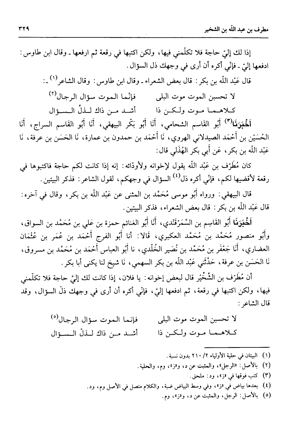 إذا لك إلي حاجة فلا تكلمني فيها ولكن اكتبها في رقعة ثم ارفعها وقال ابن طاوس ادفعها إلي فإني أكره أن أرى في وجهك ذل السؤال قال عبد الله بن بكر قال بعض ض الشعراء وقال ابن طاوس وقال الشاعر (1) * لا تحسبن الموت موت البلى * فإنما الموت سؤال الرجال (2) كلاهما موت ولكن ذا * أشد من ذاك لذل السؤال * أخبرنا (3) أبو القاسم الشحامي أنا أبو بكر البيهقي أنا أبو القاسم السراج أنا الحسين بن أحمد الصيدلاني الهروي نا أحمد بن حمدون بن عمارة نا الحسن بن عرفة نا عبد الله بن بكر عن أبي بكر الهذلي قال كان مطرف بن عبد الله يقول لإخوانه ولأودائه إنه إذا كانت لكم حاجة فاكتبوها في رقعة لأقضيها لكم فإني أكره ذل (4) السؤال في وجهكم لقول الشاعر فذكر البيتين قال البيهقي ورواه أبو موسى محمد بن المثنى عن عبد الله بن بكر وقال في آخره قال عبد الله بن بكر قال بعض الشعراء فذكر البيتين أخبرنا أبو القاسم بن السمرقندي أنا أبو الغنائم حمزة بن علي بن محمد بن السواق وأبو منصور محمد بن محمد العكبري قالا أنا أبو الفرج أحمد بن عمر بن عثمان العضاري أنا جعفر بن محمد بن نصير الخلدي نا أبو العباس أحمد بن محمد بن مسروق نا الحسن بن عرفة حدثني عبد الله بن بكر السهمي نا شيخ لنا يكنى أبا بكر أن مطرف بن الشخير قال لبعض إخوانه يا فلان إذا كانت لك إلي حاجة فلا تكلمني فيها ولكن اكتبها في رقعة ثم ادفعها إلي فإني أكره أن أرى في وجهك ذل السؤال وقد قال الشاعر * لا تحسبن الموت موت البلى * فإنما الموت سؤال الرجال (5) كلاهما موت ولكن ذا * أشد من ذاك لذل السؤال *