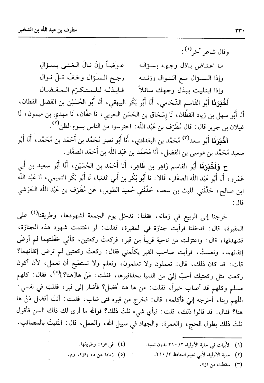 أخبرنا أبو القاسم الشحامي أنا أبو بكر البيهقي أنا أبو الحسين بن الفضل القطان أنا أبو سهل بن زياد القطان نا إسحاق بن الحسن الحربي نا عفان نا مهدي بن ميمون نا غيلان بن جرير قال قال مطرف بن عبد الله احترسوا من الناس بسوء الظن (2) أخبرنا أبو سعد (3) محمد بن البغدادي أنا أبو نصر محمد بن أحمد بن محمد أنا أبو سعيد محمد بن موسى بن الفضل أنا محمد بن عبد الله بن أحمد الصفار ح وأخبرنا أبو القاسم زاهر بن طاهر أنا أحمد بن الحسين أنا أبو سعيد بن أبي عمرو أنا أبو عبد الله الصفار قالا نا أبو بكر بن أبي الدنيا نا أبو بكر التميمي نا عبد الله ابن صالح حدثني الليث بن سعد حدثني حميد الطويل عن مطرف بن عبد الله الحرشي قال خرجنا إلى الربيع في زمانه فقلنا ندخل يوم الجمعة لشهودها وطريقنا (4) على المقبرة قال فدخلنا فرأيت جنازة في المقبرة فقلت لو اغتنمت شهود هذه الجنازة فشهدتها قال واعتزلت من ناحية قريبا من قبر فركعت ركعتين كأني خففتهما لم أرض إتقانهما ونعست فرأيت صاحب القبر يكلمني فقال ركعت ركعتين لم ترض إتقانهما قلت قد كان ذلك قال تعملون ولا تعلمون ونعلم ولا نستطيع أن نعمل لأن أكون ركعت مثل ركعتيك أحب إلي من الدنيا بحذافيرها فقلت من ها هنا (5) فقال كلهم مسلم وكلهم قد أصاب خيرا فقلت من ها هنا أفضل فأشار إلى قبر فقلت في نفسي اللهم ربنا أخرجه إلي فأكلمه قال فخرج من قبره فتى شاب فقلت أنت أفضل من ها هنا فقال قد قالوا ذلك قلت فبأي شئ نلت ذلك فوالله ما أرى لك ذلك السن فأقول نلت ذلك بطول الحج والعمرة والجهاد في سبيل الله والعمل قال ابتليت بالمصائب