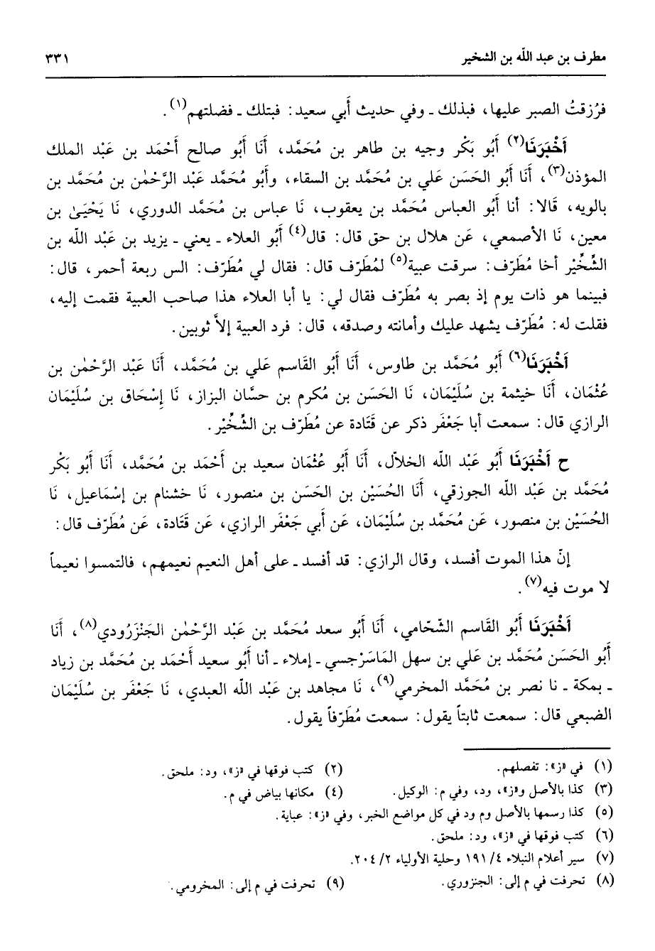 فرزقت الصبر عليها فبذلك وفي حديث أبي سعيد فبتلك فضلتهم (1) أخبرنا (2) أبو بكر وجيه بن طاهر بن محمد أنا أبو صالح أحمد بن عبد الملك المؤذن (3) أنا أبو الحسن علي بن محمد بن السقاء وأبو محمد بن عبد الرحمن بن محمد بن بالويه قالا أنا أبو العباس محمد بن يعقوب نا عباس بن محمد الدوري نا يحيى بن معين نا الأصمعي عن هلال بن حق قال قال (4) أبو العلاء يعني يزيد بن عبد الله بن الشخير أخا مطرف سرقت عبية (5) لمطرف قال فقال لي مطرف الس ربعه أحمر قال فبينما هو ذات يوم إذ بصر به مطرف فقال لي يا أبا العلاء هذا صاحب العبية فقمت إليه فقلت له مطرف يشهد عليك وأمانته وصدقه قال فرد العبية إلا ثوبين أخبرنا (6) أبو محمد بن طاوس أنا أبو القاسم علي بن محمد أنا عبد الرحمن بن عثمان أنا خيثمة بن سليمان نا الحسن بن مكرم بن حسان البزاز نا إسحاق بن سليمان الرازي قال سمعت أبا جعفر ذكر عن قتادة عن مطرف بن الشخير ح أخبرنا أبو عبد الله الخلال أنا أبو عثمان سعيد بن أحمد بن محمد أنا أبو بكر محمد بن عبد الله الجوزقي أنا الحسين بن الحسن بن منصور نا خشنام بن إسماعيل نا الحسين بن منصور عن محمد بن سليمان عن أبي جعفر الرازي عن قتادة عن مطرف قال إن هذا الموت أفسد وقال الرازي قد أفسد على أهل النعيم نعيمهم فالتمسوا نعيما لا موت فيه (7) أخبرنا أبو القاسم الشحامي أنا أبو سعد محمد بن عبد الرحمن الجنزرودي (8) أنا أبو الحسن محمد بن علي بن سهل الماسرجسي إملاء أنا أبو سعيد أحمد بن محمد بن زياد بمكة نا نصر بن محمد المخرمي (9) نا مجاهد بن عبد الله العبدي نا جعفر بن سليمان الضبعي قال سمعت ثابتا يقول سمعت مطرفا يقول